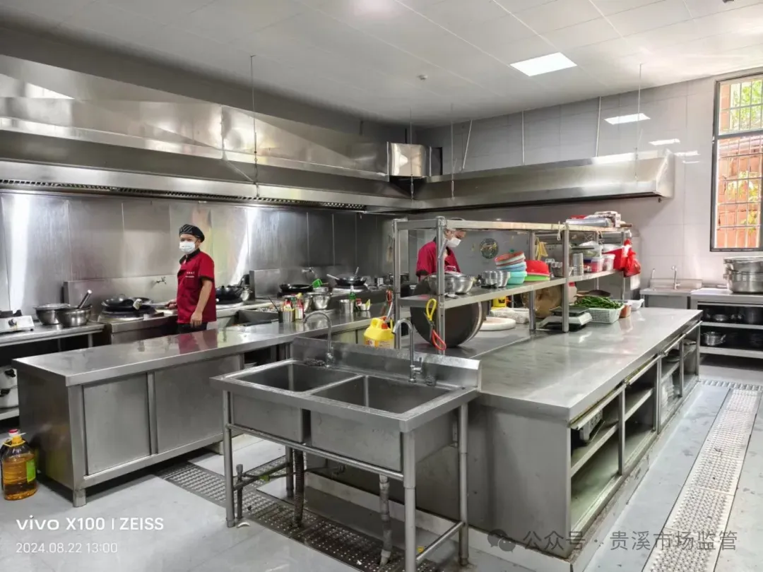 后厨干净整洁无油污,厨具摆放有序
