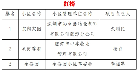 请获得“红榜”的小区保持积极向上的态势,做好表率,持之以恒做好小区管理工作;获得“黑榜”的小区要知耻而后勇,积极整改,切实加强小区管理建设,共建美好家园!