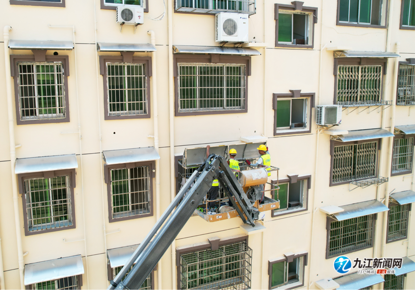 九江新闻网讯(九江日报全媒记者 张驰 摄)9月4日,浔阳区人民路街道向阳北苑片区老旧小区改造项目有序推进,工人正加紧施工保障进度。据悉,此次改造主要内容包括房屋修缮、落水管改造、空调冷凝水管改造,防盗网及晾衣架改造等,共计改造建筑33栋,涉及居民567户,建筑面积4.5万平方米。