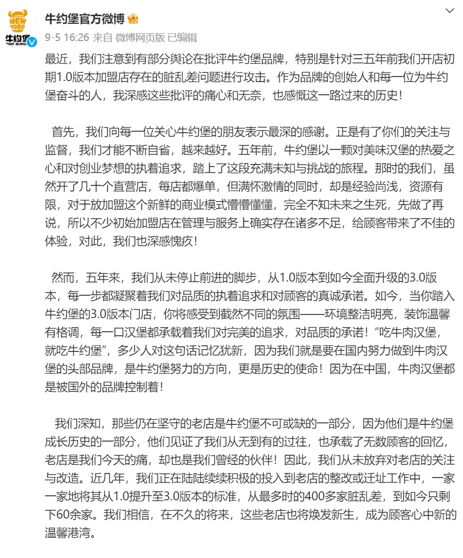 9月5日,牛约堡通过官方微博承认问题所在,并表示已在改进。同时表示,将对门店形象进行全面升级。合同即将到期且从未进行过形象升级的老加盟商,在合同到期前,按照其最新版的标准形象进行统一升级。