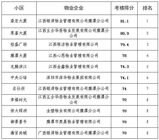 4.其中排名并列第八名的物业公司:江西五合华居物业发展有限公司鹰潭分公司、金碧物业有限公司鹰潭分公司、鹰潭市奥晨物业管理有限公司、广西银湾物业管理有限公司鹰潭分公司,被市创建办督查下了白单,工作严重落后。请各小区物业高度重视,引以为戒。