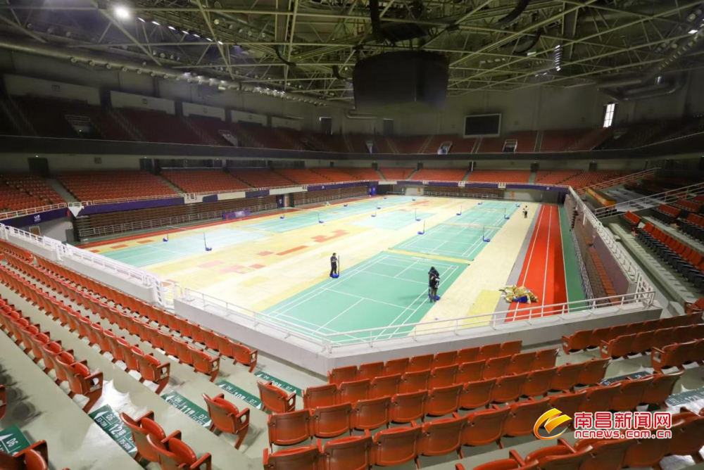 9月11日,记者在2024年尤尼克斯世界青年羽毛球锦标赛比赛场馆看到,施工人员正在抓紧进行比赛场地铺设。9月30日至10月13日,2024年尤尼克斯世界青年羽毛球锦标赛将在南昌国际体育中心体育馆举行。(洪观新闻记者 杨紫韬 摄)
