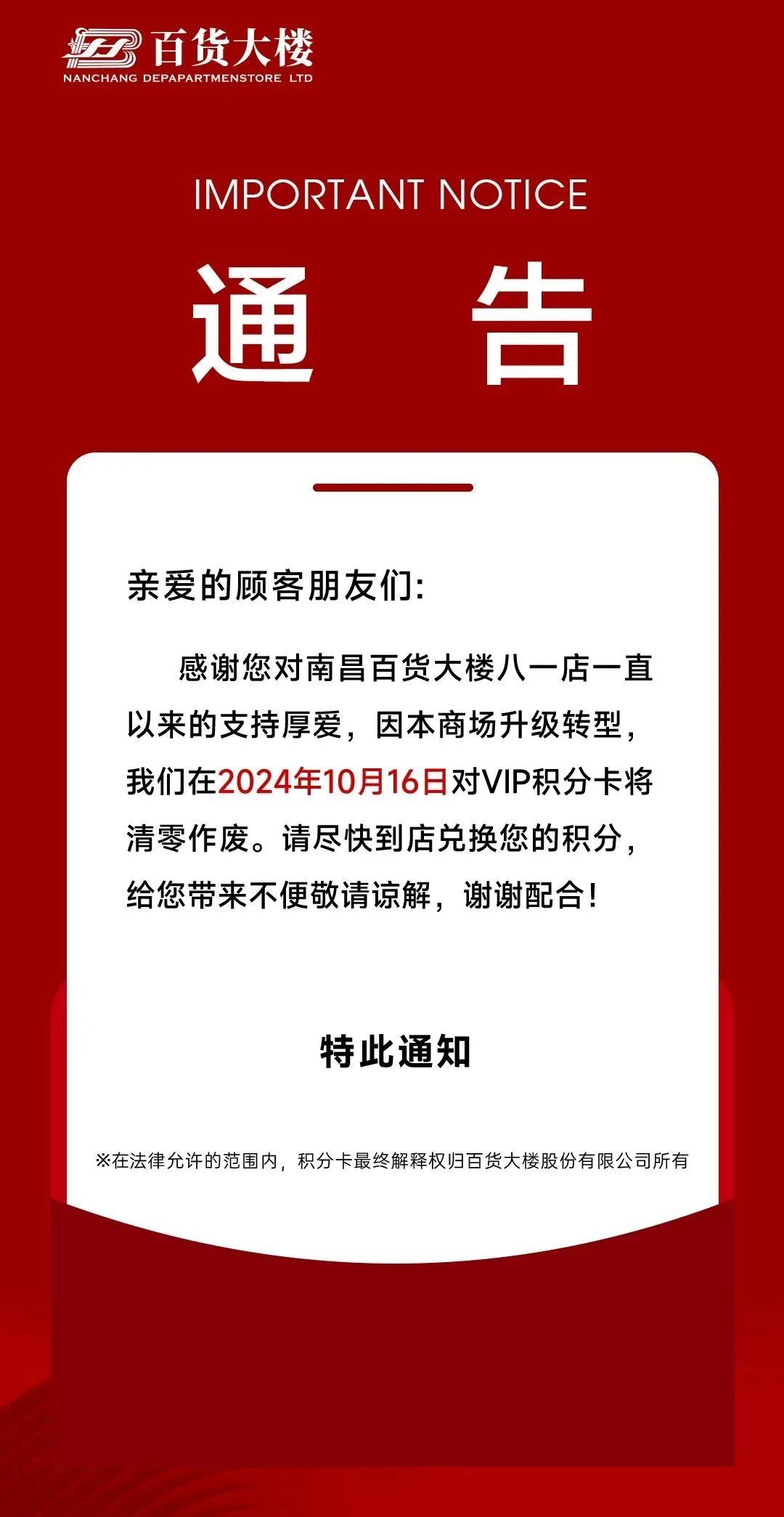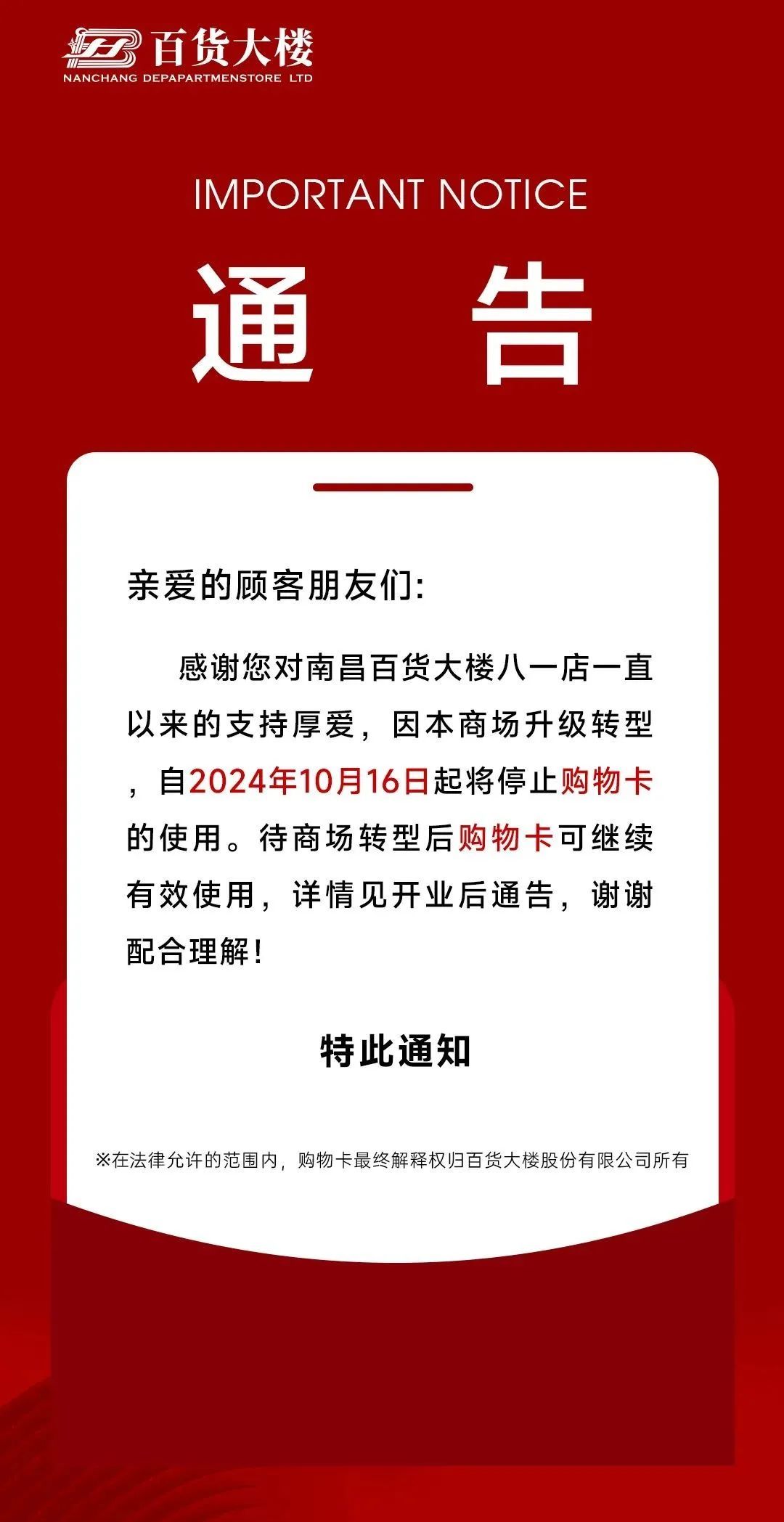 9月18日,记者在南昌百货大楼二至三层电梯处看到南昌百货大楼发出公告,因商场内部升级改造,楼层暂停营业。目前,南昌百货大楼三至五层暂停营业,有商户透露:国庆假期后商场或将全部撤店。