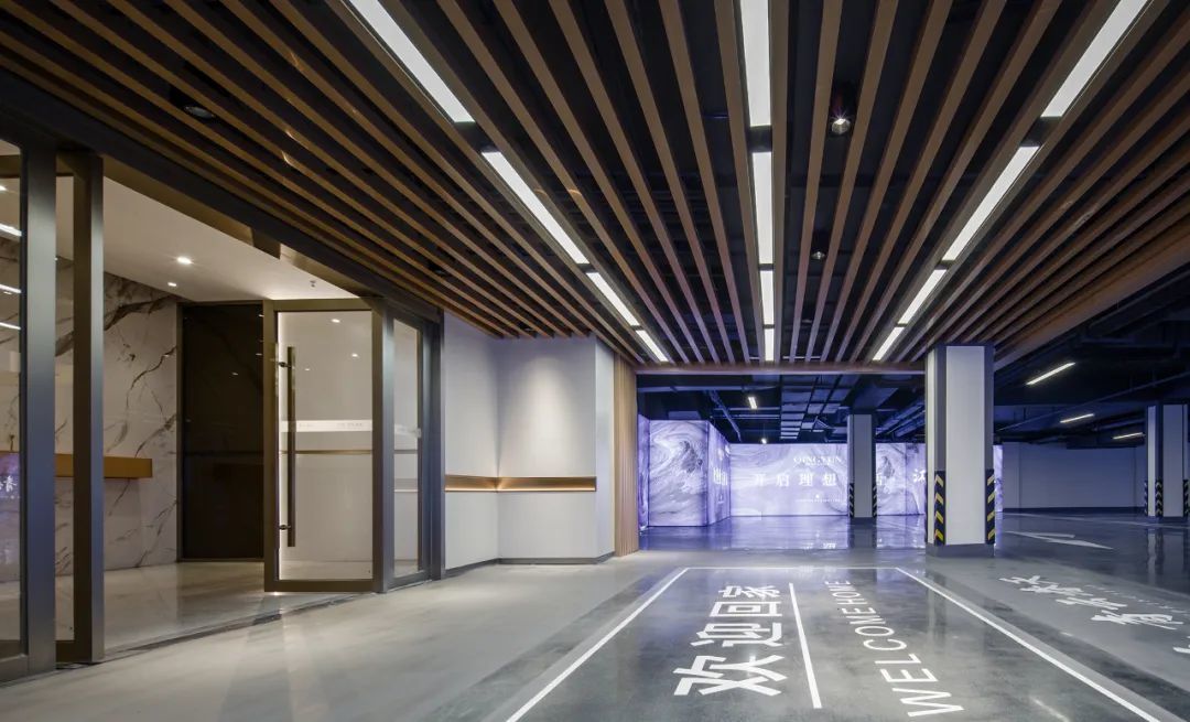 为了营造场景化归家入口,地下车库出入口通道顶部采用金属格栅吊顶+透明玻璃顶棚设计,引入更多自然光线,让汽车从外部进入的时候,视线明暗上的切换变得更自然。