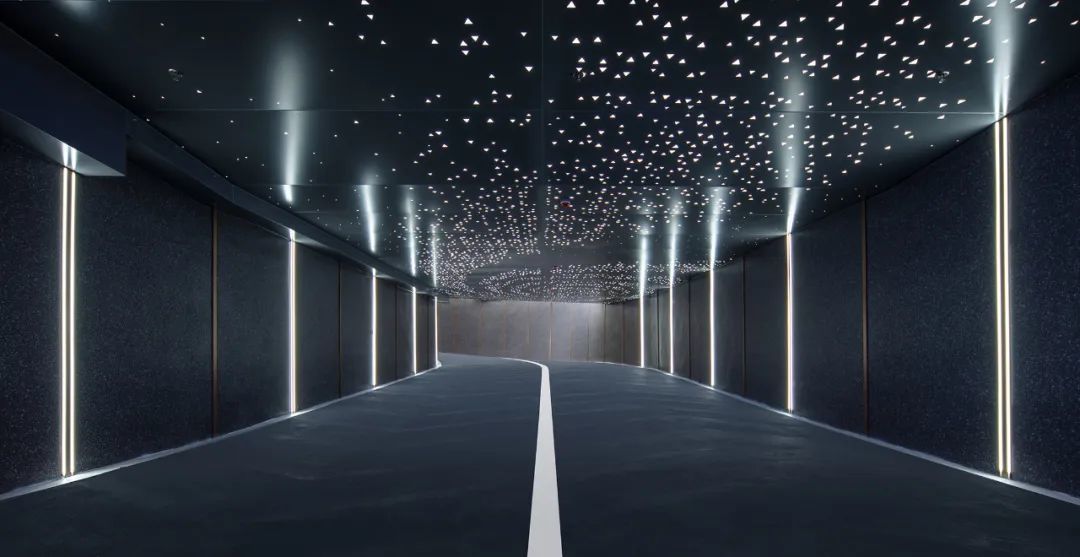 车库坡道顶部便是穿孔打造的星空弯顶,这种只有一线城市的豪宅配备规格,将归家仪式感完全拿捏住。