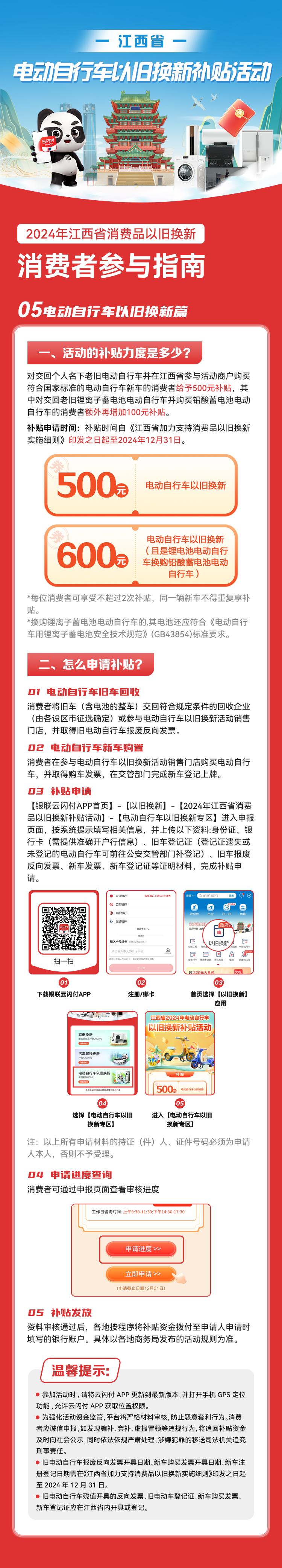根据细则规定,9月27日起,消费者在省级服务平台正确上传资料后,15天内即可得到补贴。自2024年9月19日起至2024年12月31日,对交回个人名下老旧电动自行车并在江西省换购符合国家标准的电动自行车新车的消费者给予500元补贴,其中对交回老旧锂离子蓄电池电动自行车并换购铅酸蓄电池电动自行车的消费者额外再增加100元补贴。