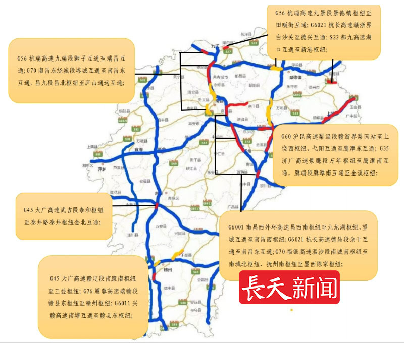 G70福银高速温沙段南城南枢纽至南城北枢纽、抚州南枢纽至昌东南枢纽,南昌东绕城段塔城互通至南昌东互通,昌九段昌北枢纽至庐山通远互通;