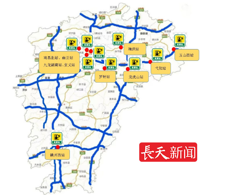 瑞赣路赣州西站、南外环路九龙湖南站、鹰瑞路北段龙虎山站、乐温路幽兰站、昌九路南昌北站、德昌路瑞洪站、温沙路罗针站、昌奉路安义站、梨温路弋阳站和德上路玉山站等收费站通行压力较大。