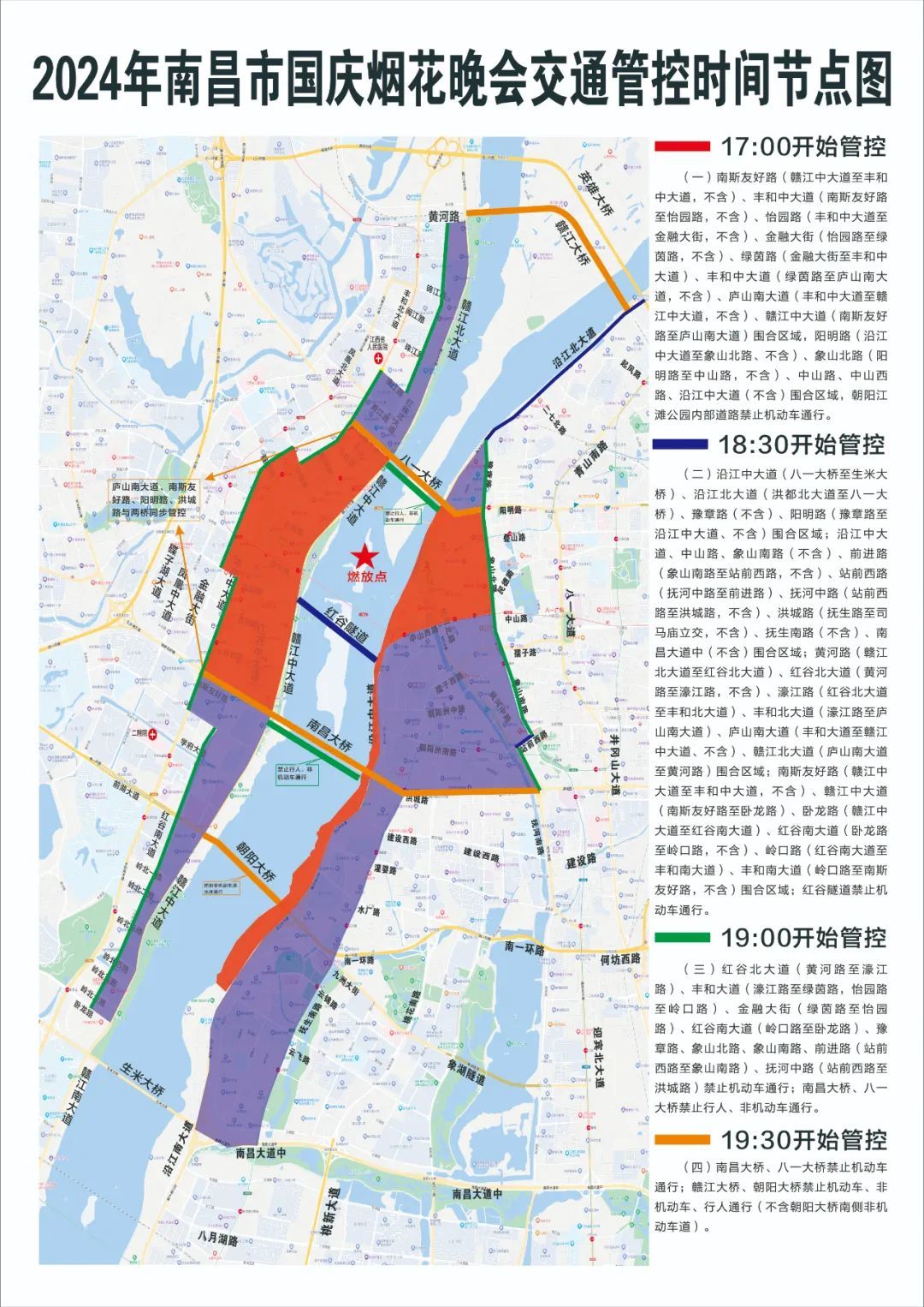 (一)自 10月1日17:00起 ,对南斯友好路(赣江中大道至丰和中大道,不含)、丰和中大道(南斯友好路至怡园路,不含)、怡园路(丰和中大道至金融大街,不含)、金融大街(怡园路至绿茵路,不含)、绿茵路(金融大街至丰和中大道)、丰和中大道(绿茵路至庐山南大道,不含)、庐山南大道(丰和中大道至赣江中大道,不含)、赣江中大道(南斯友好路至庐山南大道)围合区域,阳明路(沿江中大道至象山北路、不含)、象山北路(阳明路至中山路,不含)、中山路、中山西路、沿江中大道(不含)围合区域,朝阳江滩公园内部道路进行管控。