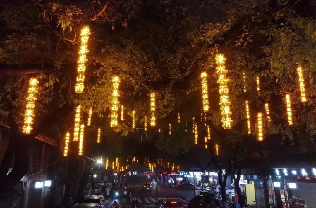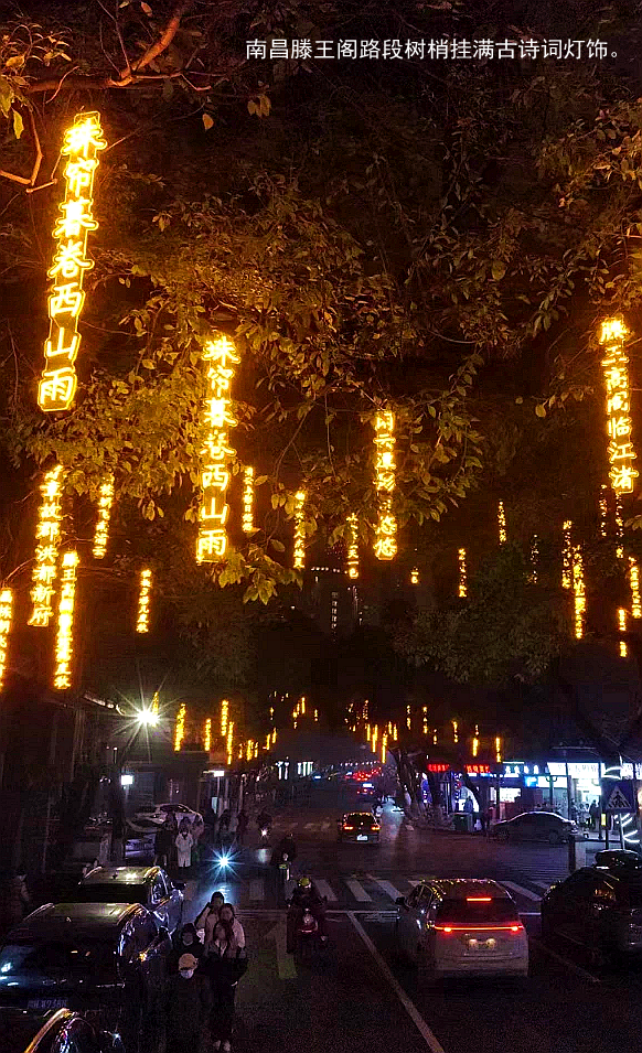 南昌滕王阁路段树梢挂满古诗词灯饰。图源洪观新闻