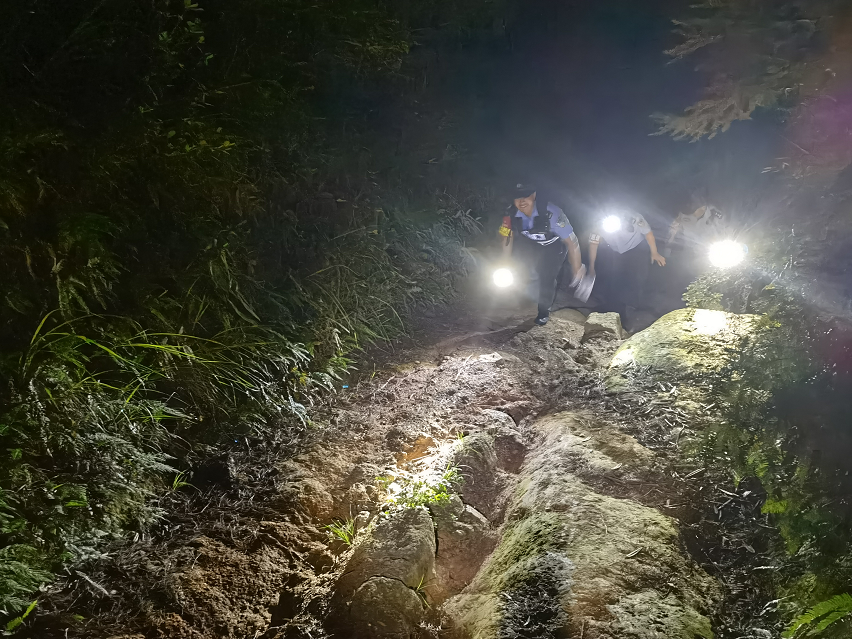 九岭山海拔近1800米,地势崎岖复杂,考虑到入夜后山中气温不到10摄氏度,为避免被困游客出现失温等危险情况,民警提前准备并携带好保暖衣物一同上山。因此时山中漆黑一片,手机信号时断时续,民警只能徒步展开救援。