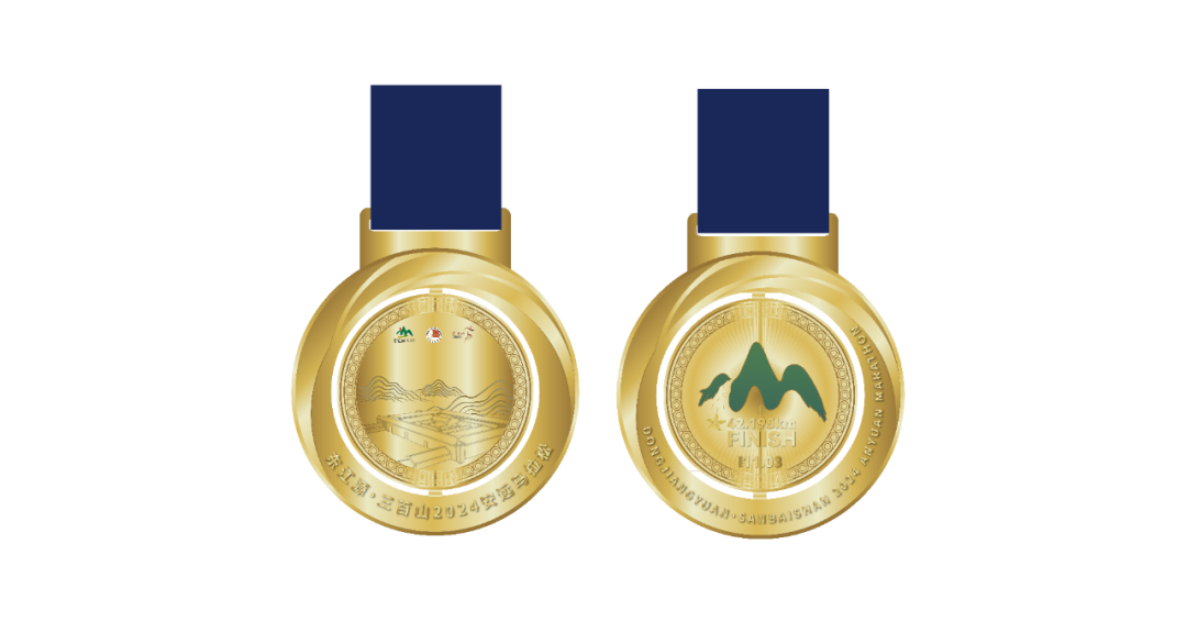 奖牌整体采用亮金色,象征着荣耀与辉煌。寓意着参赛者们在马拉松赛道上挥洒汗水、追逐梦想的光辉历程。奖牌中间则融入了安远特色三百山和东生围,让奖牌更有辨识度。旋转的设计寓意着运动与变化,象征着参赛者在马拉松赛程中不断挑战自我、突破极限的精神。