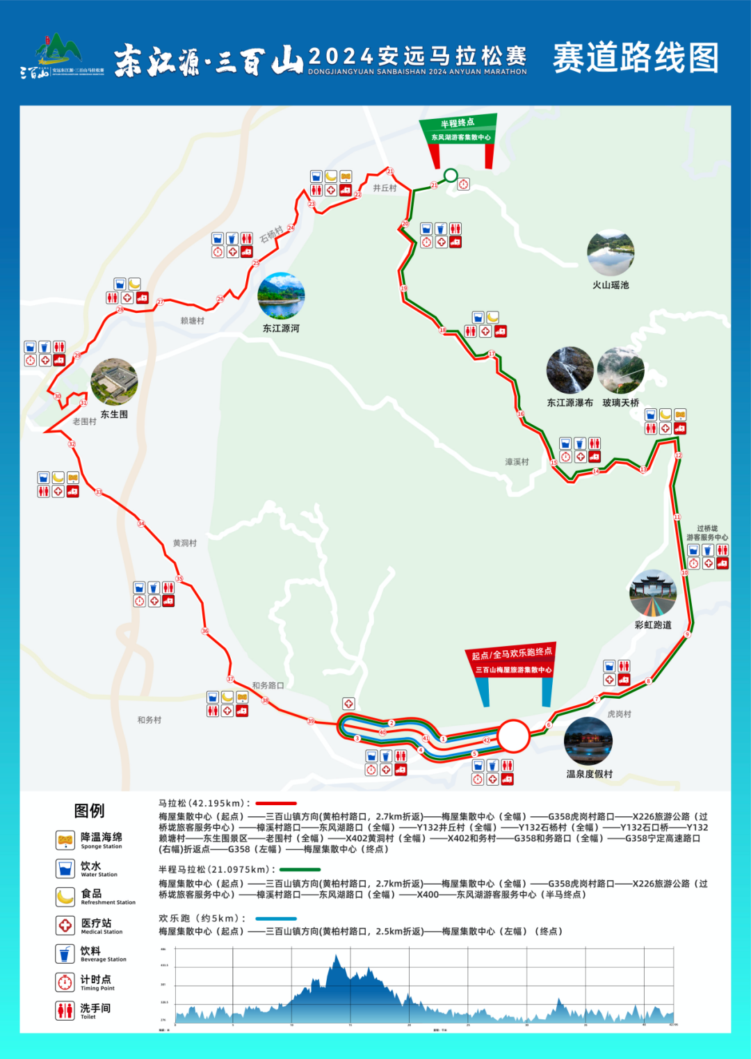 赛事以“东江源头 翡翠安远”为主题,将“安远客家文化元素”深度融入赛事奖牌、参赛服等相关产品。赛道环绕三百山景区,充分凝聚三百山最美风景线,全面展现安远的地域风情、时代风貌和人文风格,打造最美马拉松赛道。