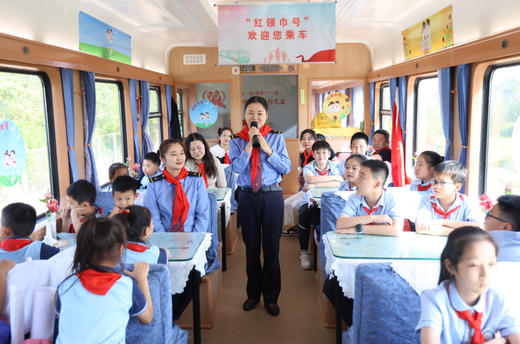 “中国少年先锋队在中国共产党的领导下,在共青团的带领下,引领少先队员继承革命先辈的事业,不断成长为社会主义建设者和接班人……”“红领巾号”列车校外辅导员杨隽雯带领刚登车的队员来到列车“文化长廊”,图文并茂地向他们介绍少先队的光荣历程和“红领巾号”列车的诞生故事。