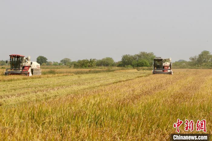 中新网南昌10月11日电 (卢梦梦)秋收时节,在江西省南昌市,95万亩中稻相继成熟,农户们正抢抓晴好天气,组织农机收割稻谷。