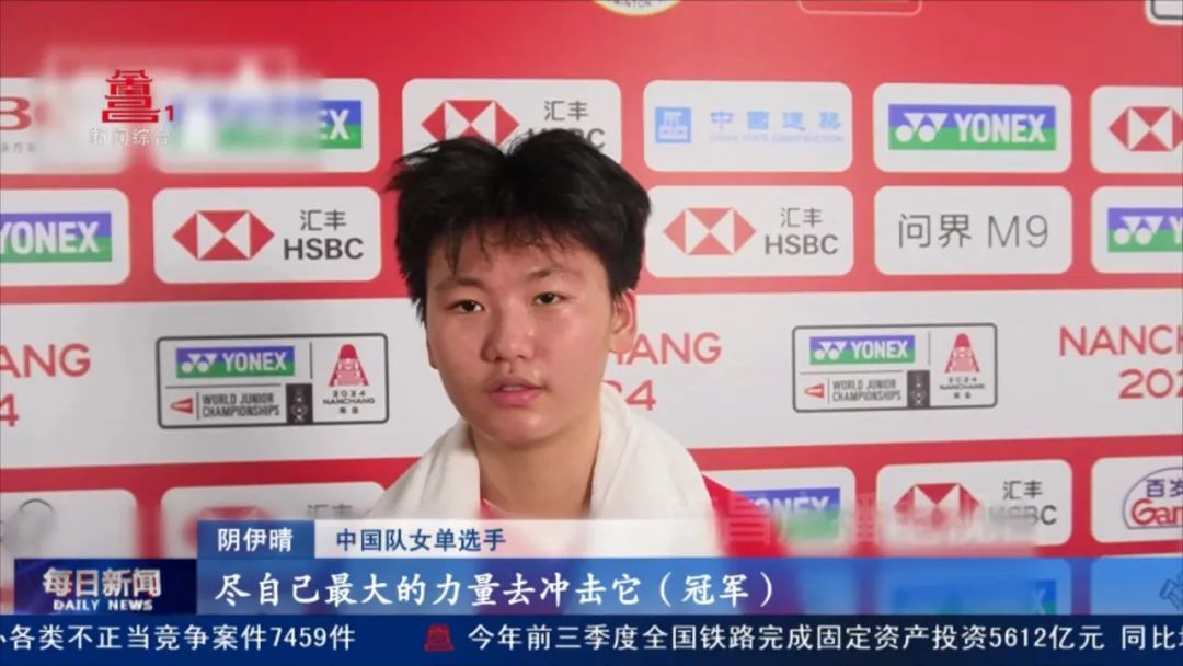 中国队女单选手阴伊晴:“特别地紧张,特别地激动,特别地困难,最后自己可能还有很多准备的细节没有完成好,但是整场自己完成下来,我觉得非常不错。(明天决赛)我自己好好准备,尽自己最大的力量去冲击它(冠军)。”