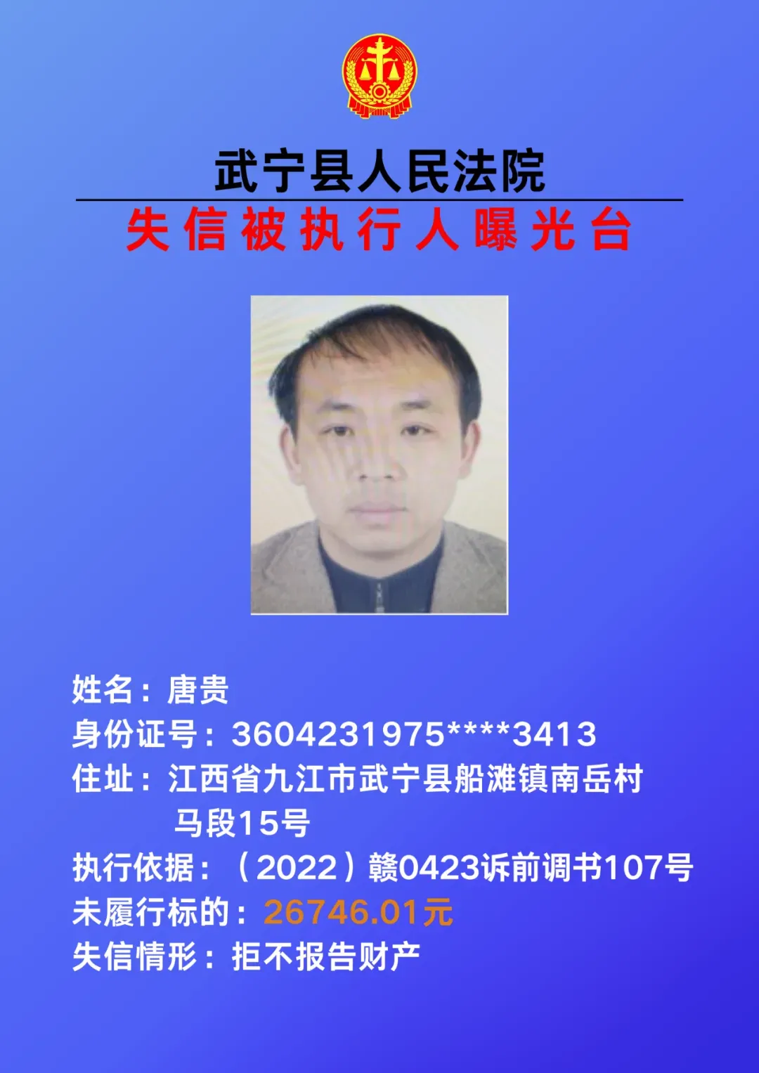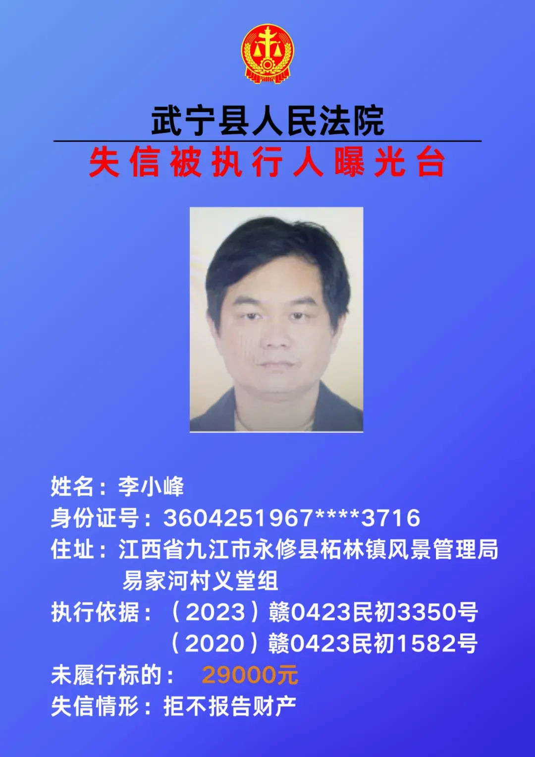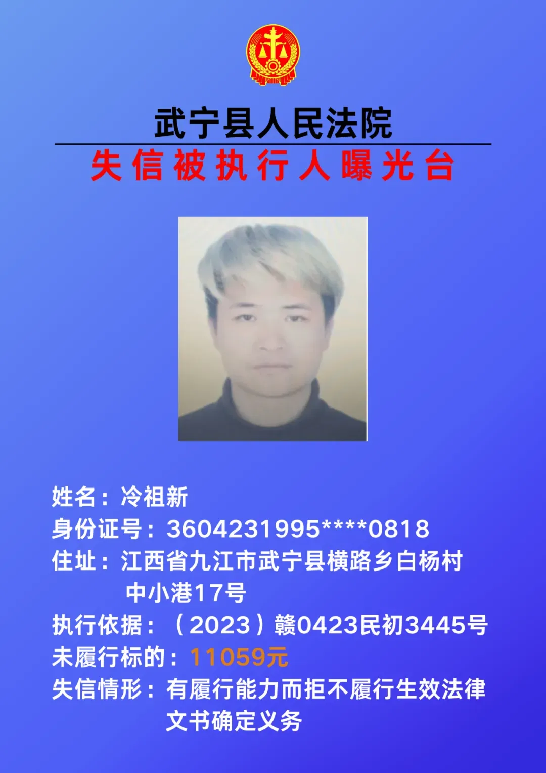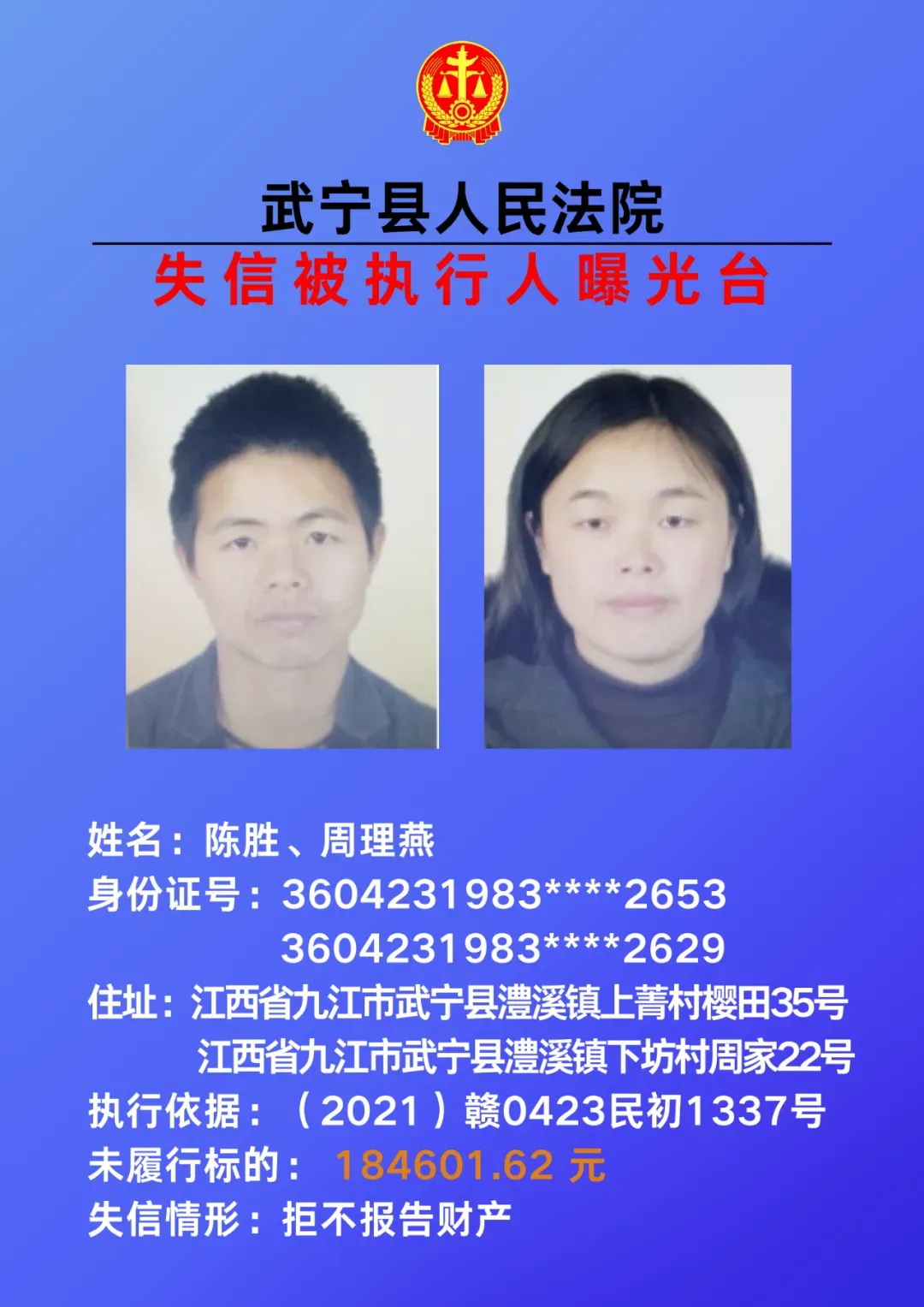 为敦促被执行人自觉履行生效法律文书确定的义务,努力推进社会诚信建设。根据《中华人民共和国民事诉讼法》、《最高人民法院关于公布失信被执行人名单信息的若干规定》等相关法律和规定,本院决定对下列失信被执行人信息予以曝光。曝光人员应立即履行生效法律文书确定的义务,否则将视情节采取罚款、拘留等强制措施,对拒不履行、抗拒执行、规避执行的被执行人将依法追究刑事责任。