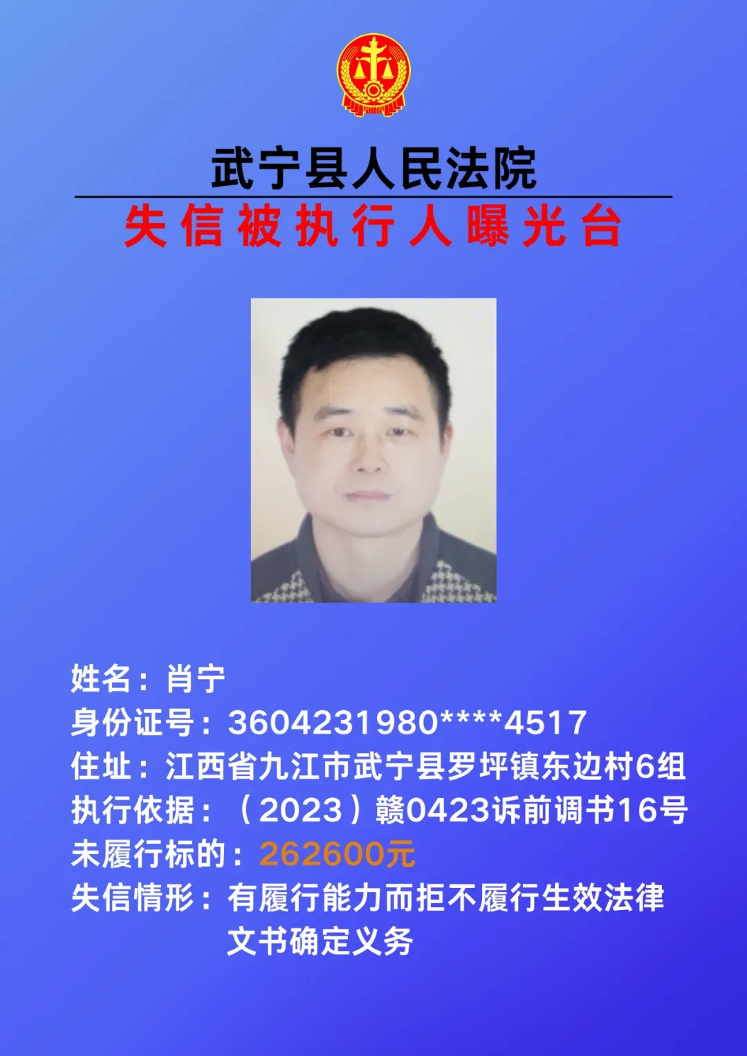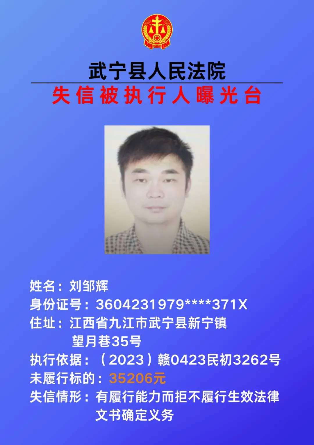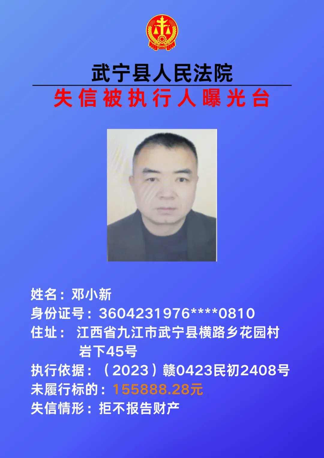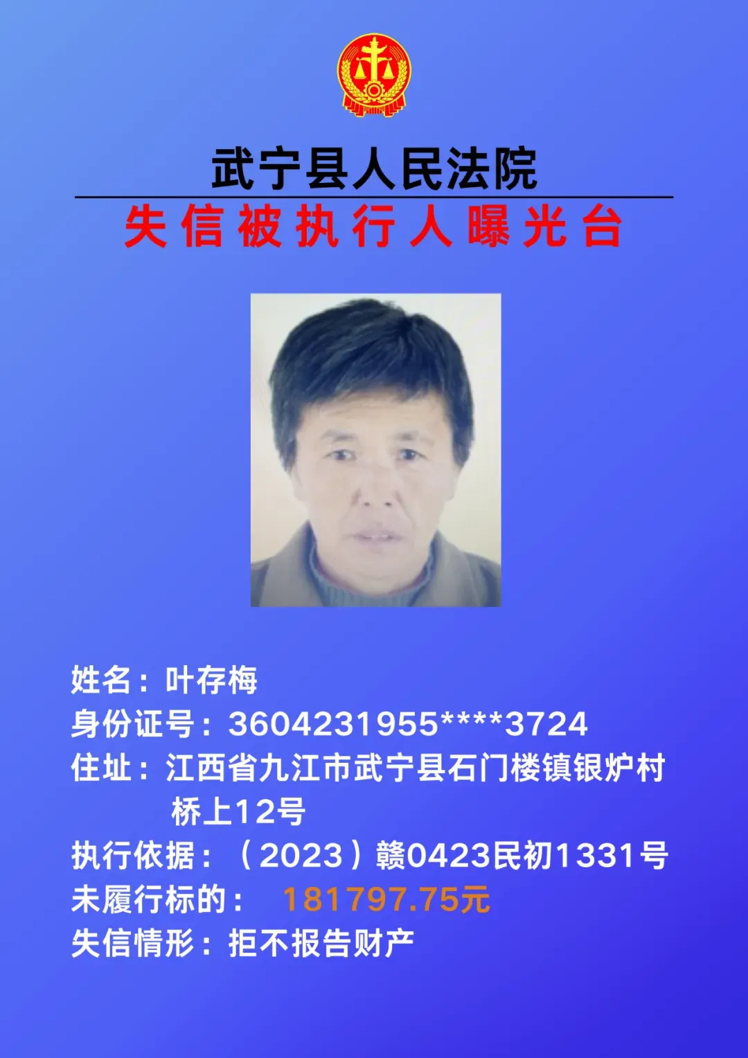 为敦促被执行人自觉履行生效法律文书确定的义务,努力推进社会诚信建设。根据《中华人民共和国民事诉讼法》、《最高人民法院关于公布失信被执行人名单信息的若干规定》等相关法律和规定,本院决定对下列失信被执行人信息予以曝光。曝光人员应立即履行生效法律文书确定的义务,否则将视情节采取罚款、拘留等强制措施,对拒不履行、抗拒执行、规避执行的被执行人将依法追究刑事责任。