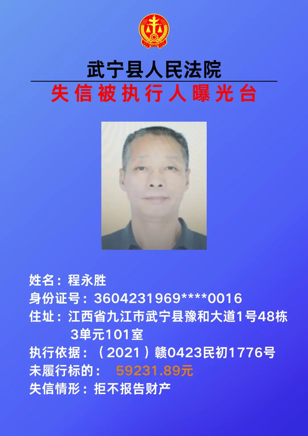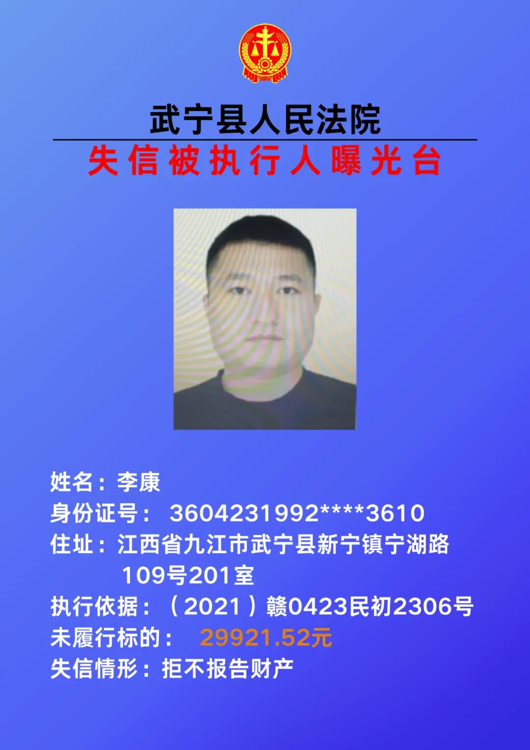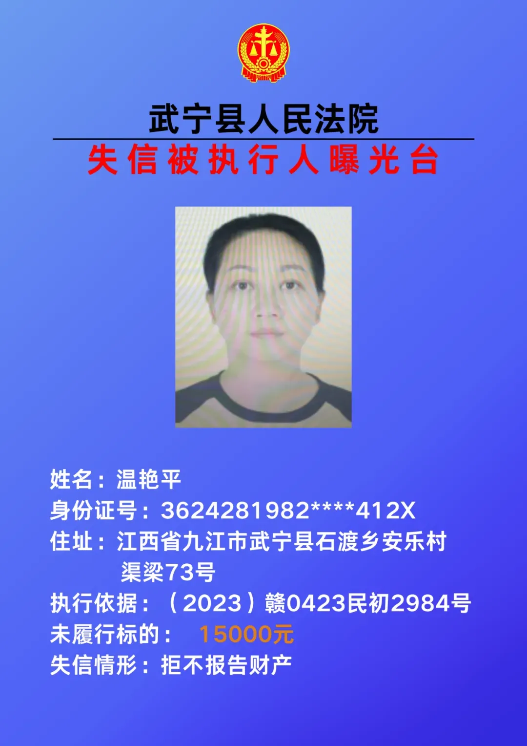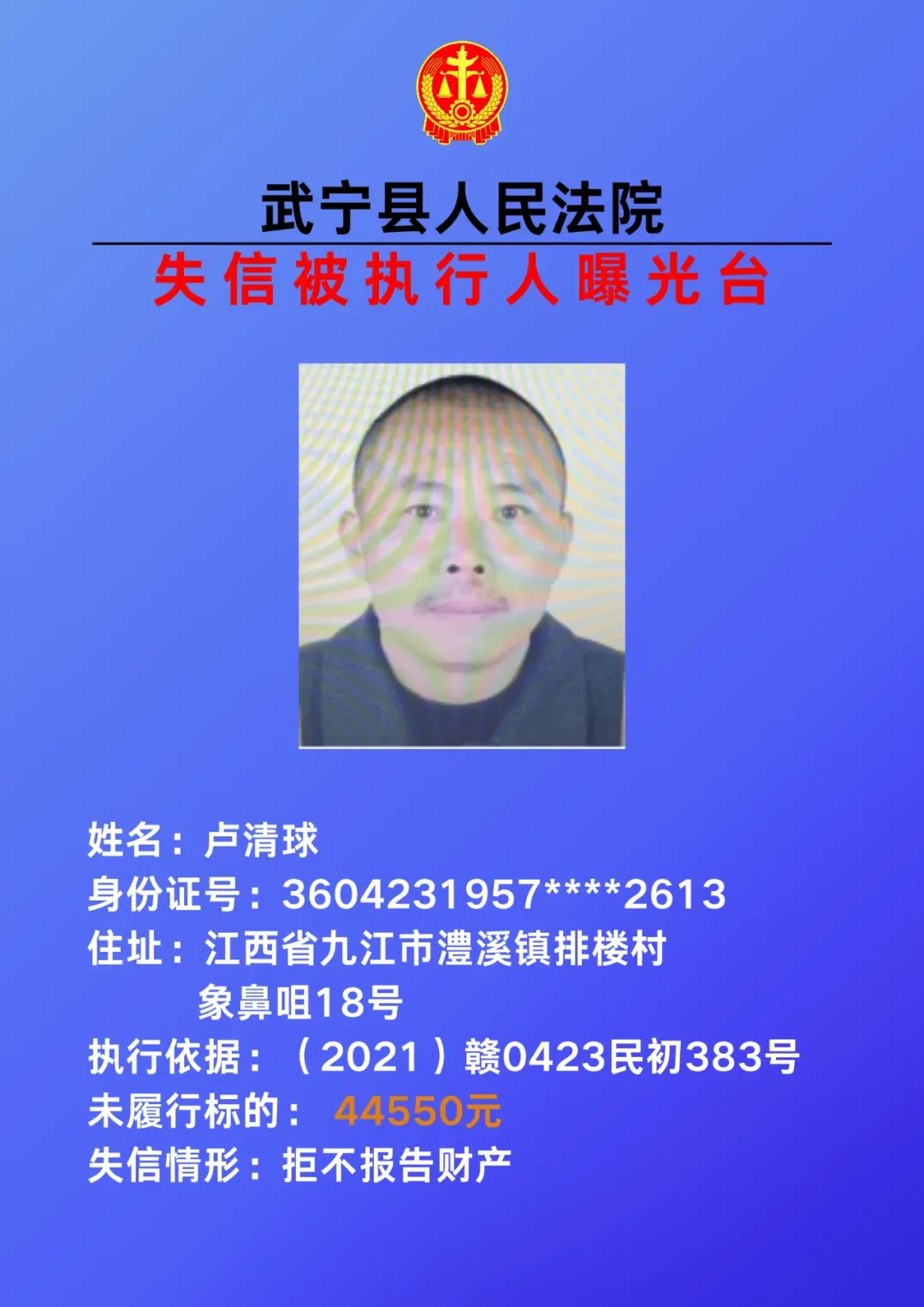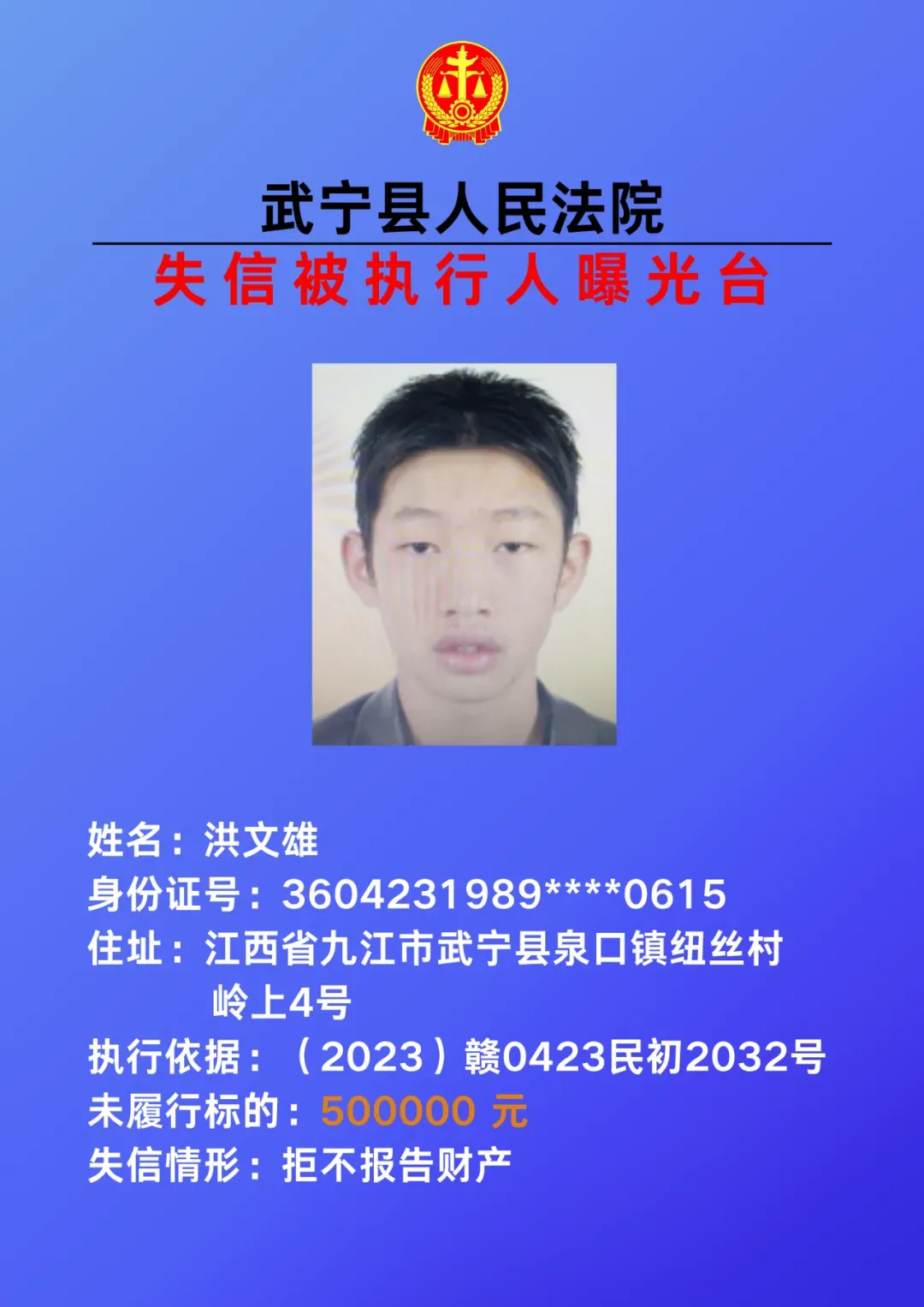 为敦促被执行人自觉履行生效法律文书确定的义务,努力推进社会诚信建设。根据《中华人民共和国民事诉讼法》、《最高人民法院关于公布失信被执行人名单信息的若干规定》等相关法律和规定,本院决定对下列失信被执行人信息予以曝光。曝光人员应立即履行生效法律文书确定的义务,否则将视情节采取罚款、拘留等强制措施,对拒不履行、抗拒执行、规避执行的被执行人将依法追究刑事责任。