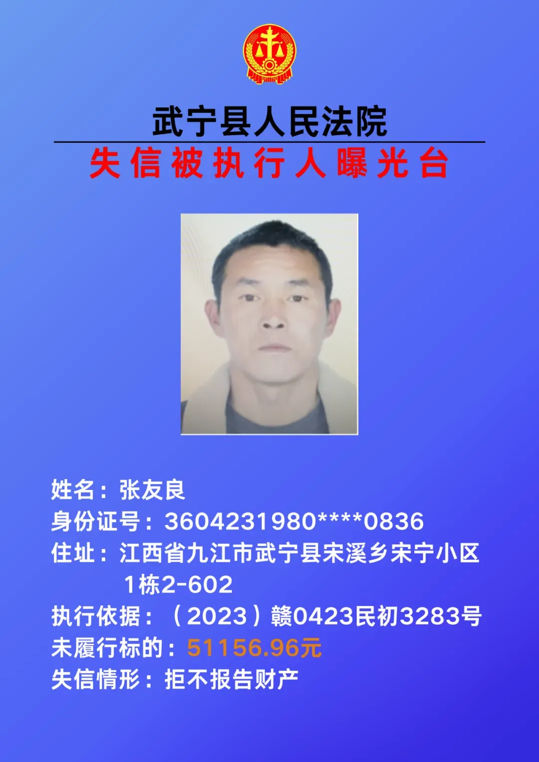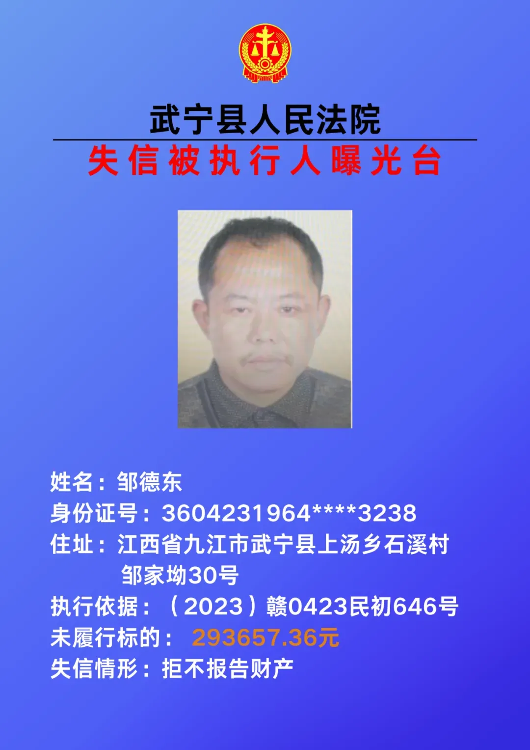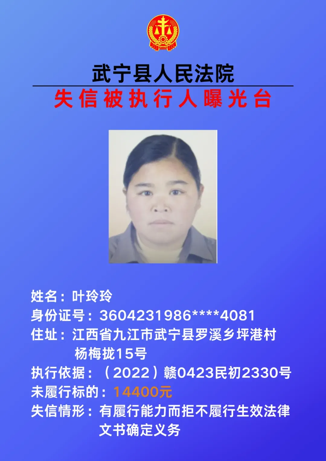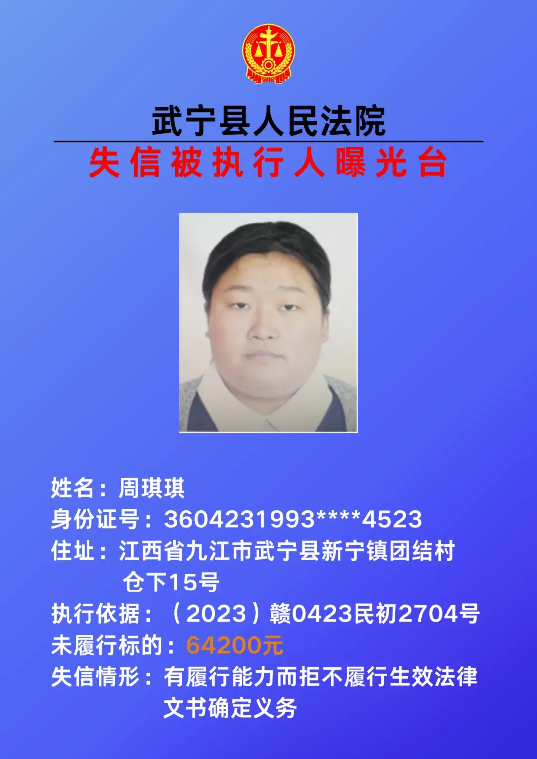 为敦促被执行人自觉履行生效法律文书确定的义务,努力推进社会诚信建设。根据《中华人民共和国民事诉讼法》、《最高人民法院关于公布失信被执行人名单信息的若干规定》等相关法律和规定,本院决定对下列失信被执行人信息予以曝光。曝光人员应立即履行生效法律文书确定的义务,否则将视情节采取罚款、拘留等强制措施,对拒不履行、抗拒执行、规避执行的被执行人将依法追究刑事责任。