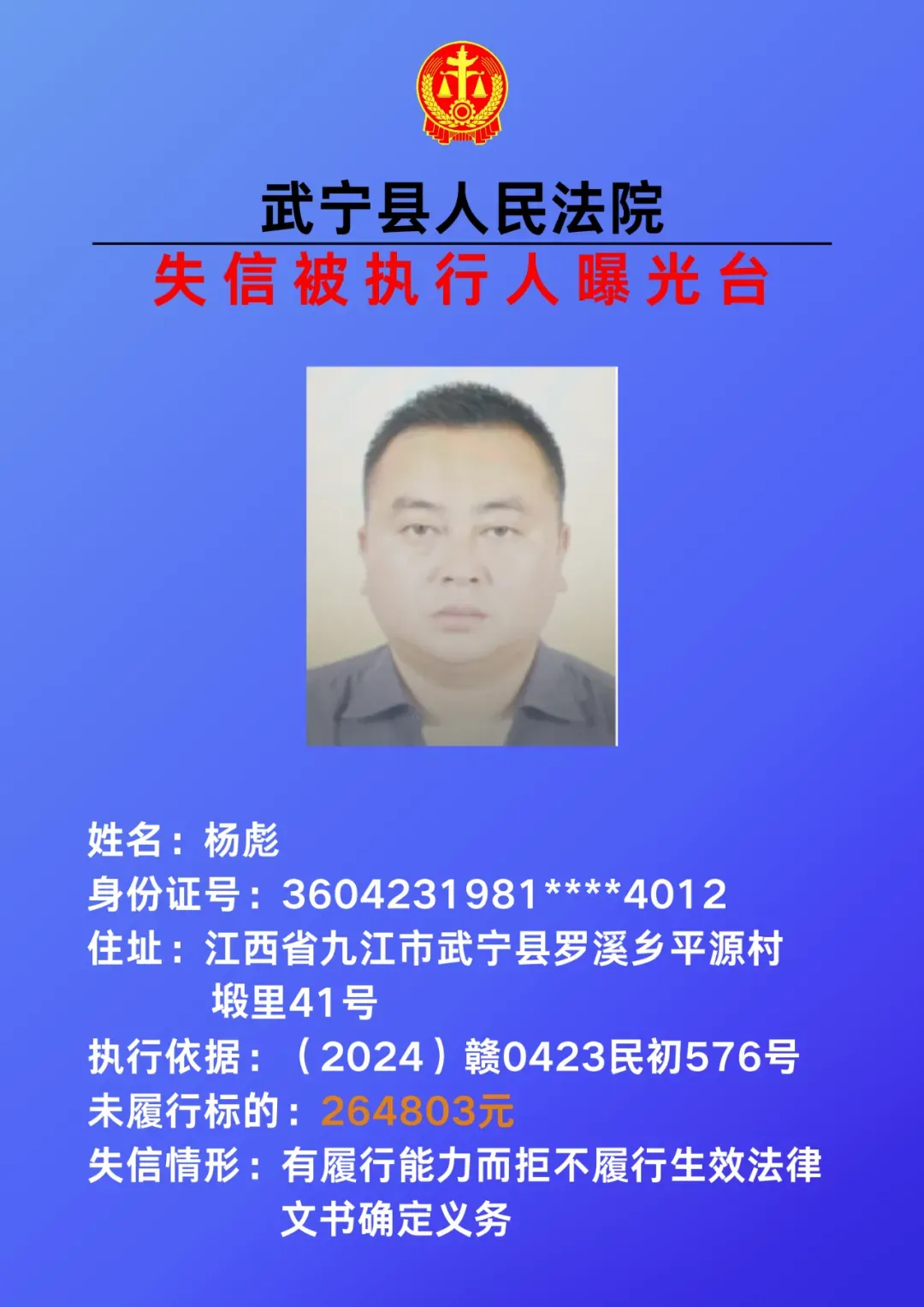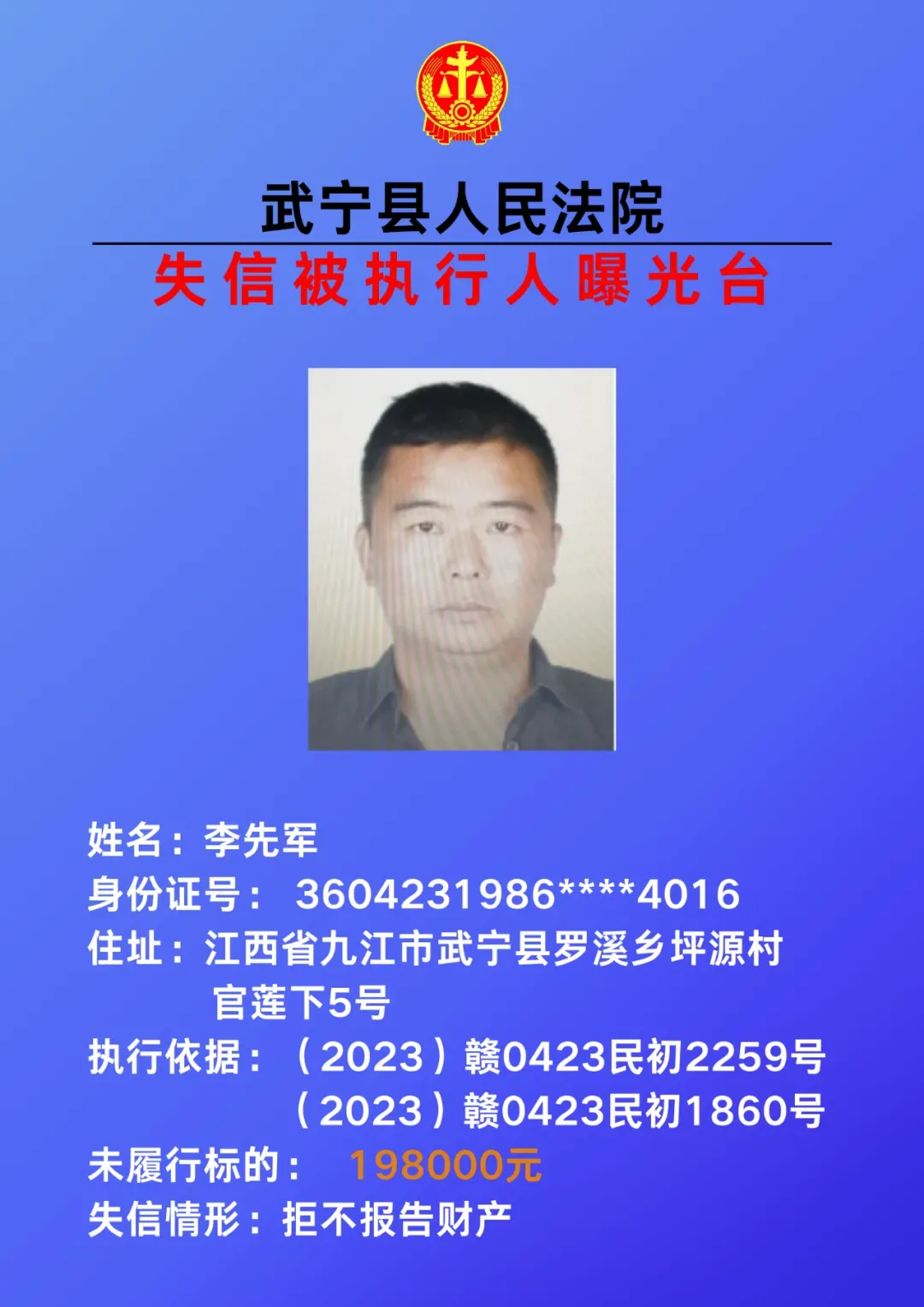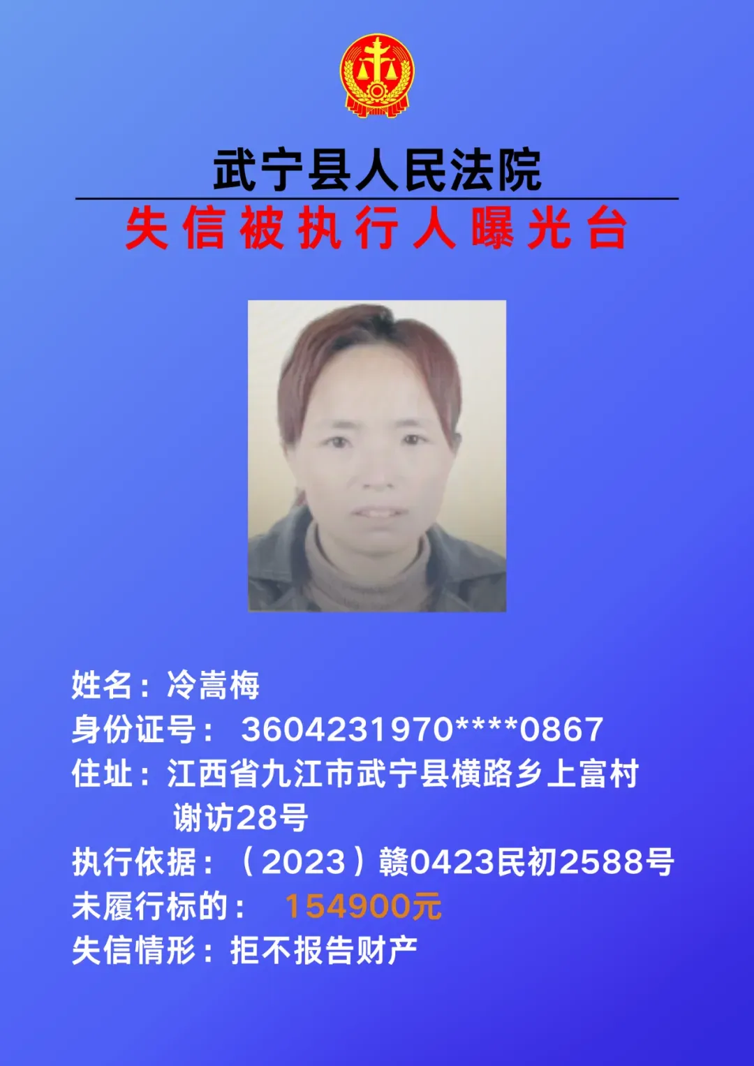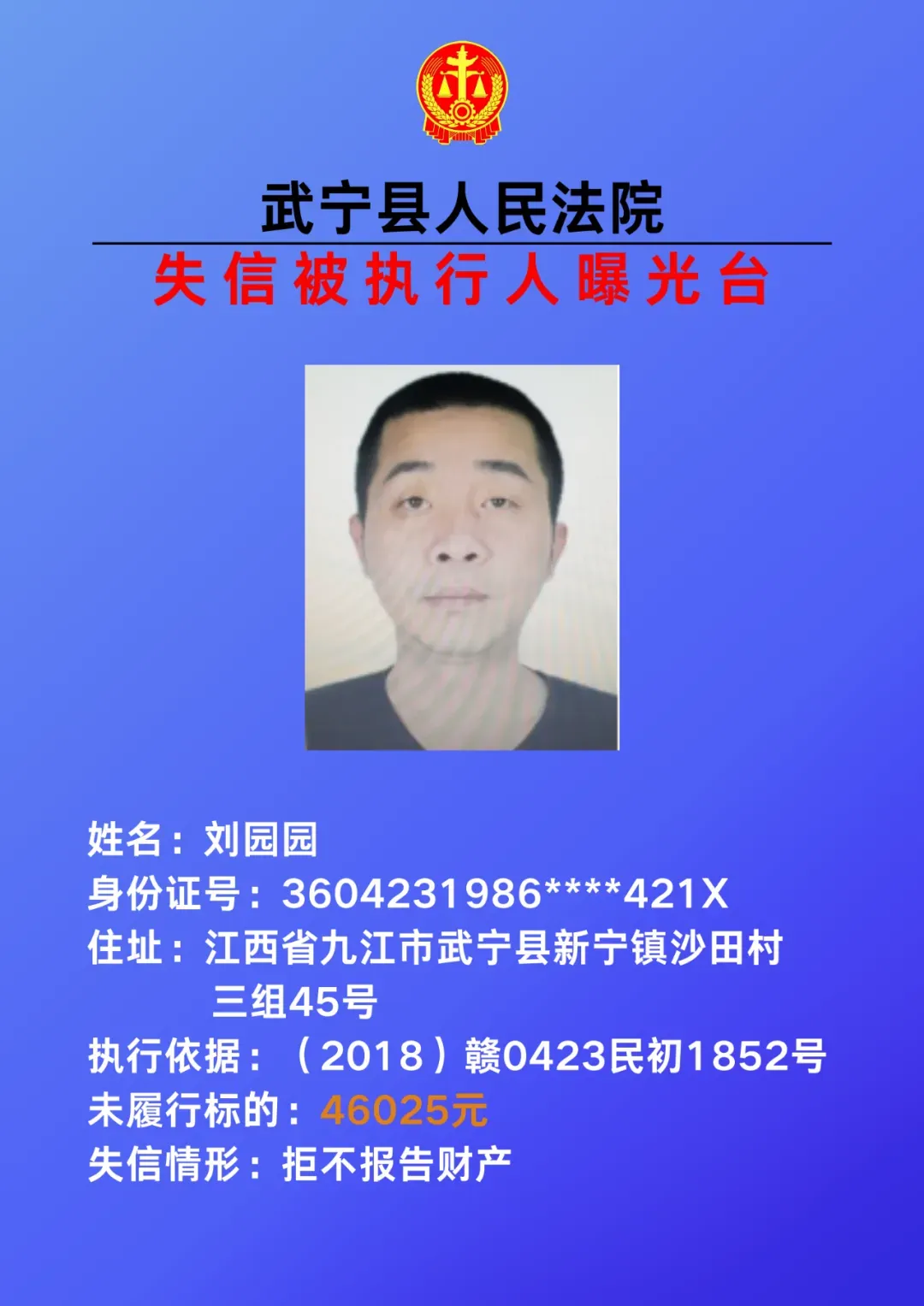为敦促被执行人自觉履行生效法律文书确定的义务,努力推进社会诚信建设。根据《中华人民共和国民事诉讼法》、《最高人民法院关于公布失信被执行人名单信息的若干规定》等相关法律和规定,本院决定对下列失信被执行人信息予以曝光。曝光人员应立即履行生效法律文书确定的义务,否则将视情节采取罚款、拘留等强制措施,对拒不履行、抗拒执行、规避执行的被执行人将依法追究刑事责任。