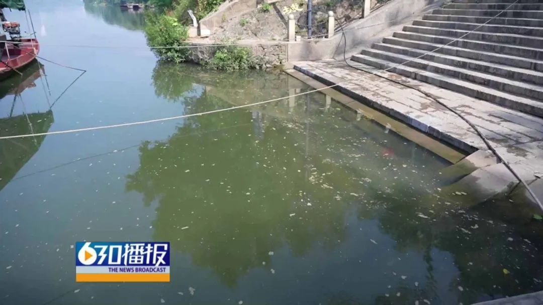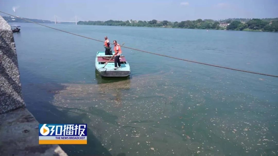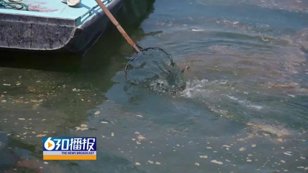 工作人员表示,水中少部分藻类死亡属于正常现象,打捞网因间隙过大无法打捞清理,只能将其打散,通过自然循环进行分解。