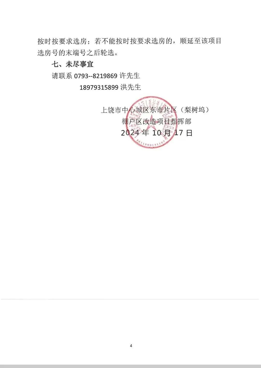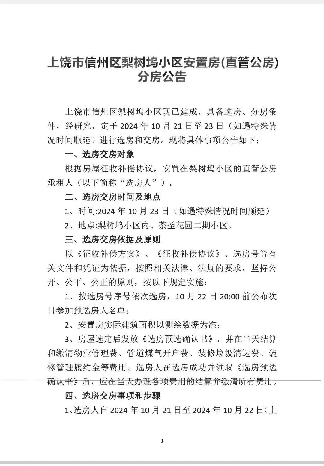 4.选房人的姓名应与《征收补偿协议》保持一致,原承租人死亡的,在2024年10月21日前由其直系亲属携带相关证明前往信州区住房保障中心咨询确认相关权益。