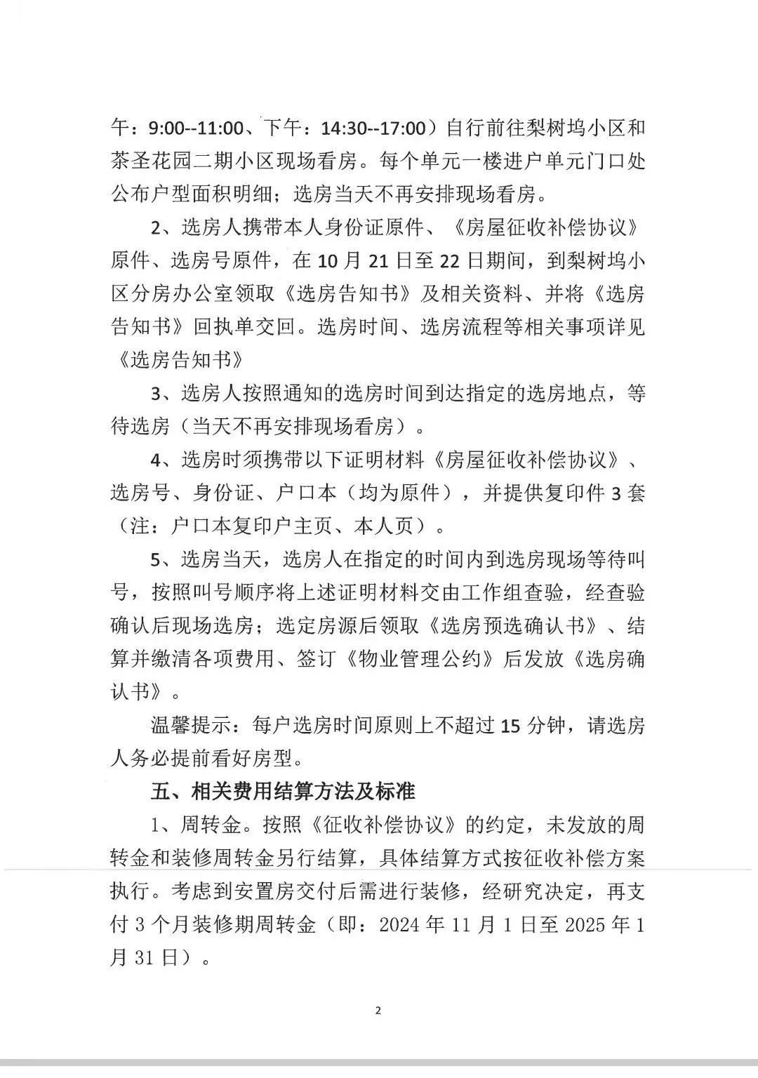 2.选房人携带本人身份证原件、《房屋征收补偿协议》原件、选房号原件,在10月21日至22日期间,到梨树坞小区分房办公室领取《选房告知书》及相关资料、并将《选房告知书》回执单交回。选房时间、选房流程等相关事项详见《选房告知书》。