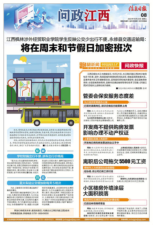 江西日报社大江大数据显示,10月21日,大江网《问政江西》共计收到帖文196条,其中,南昌县城市管理和综合执法局、南城县消防救援大队、宜春市袁州区卫生健康委员会、定南县住房和城乡建设局、安远县教育体育局、分宜县教育体育局、宜春市交通运输局等单位给予了回复,《问政江西》栏目组对上述单位表示感谢。