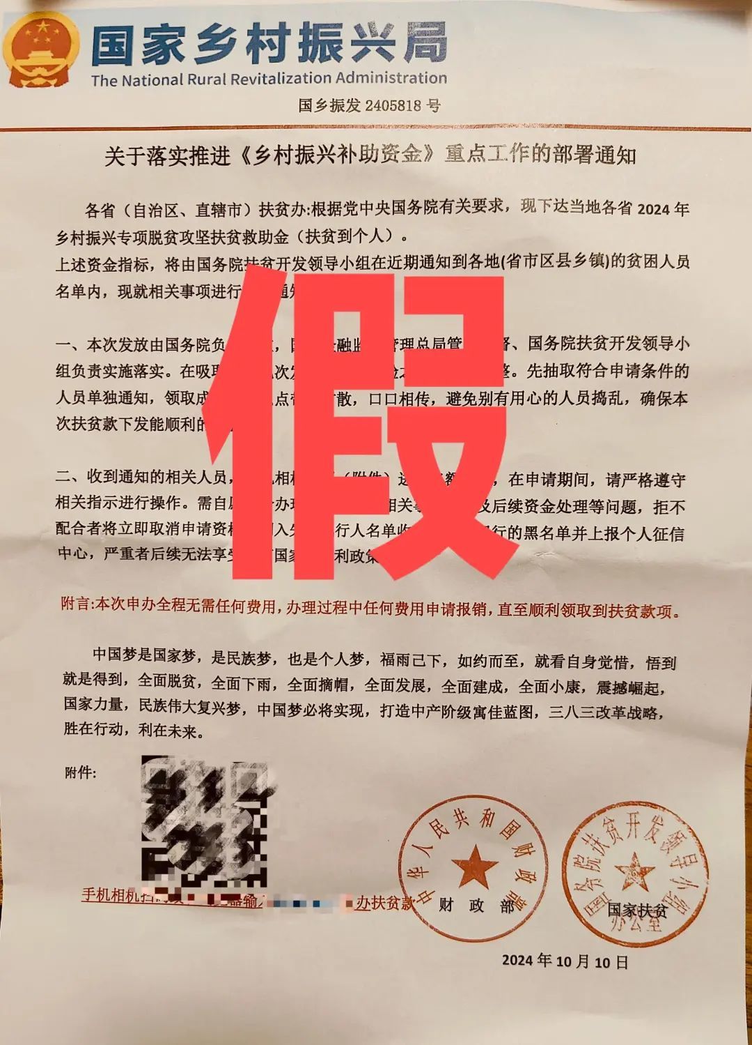 近日,遂川县草林镇的黄先生收到一个快递,里面是一份以“国家乡村振兴局”名义发布的“乡村振兴补助资金”通知,并用“中华人民共和国财政部、国务院扶贫开发领导小组办公室”落款落章。