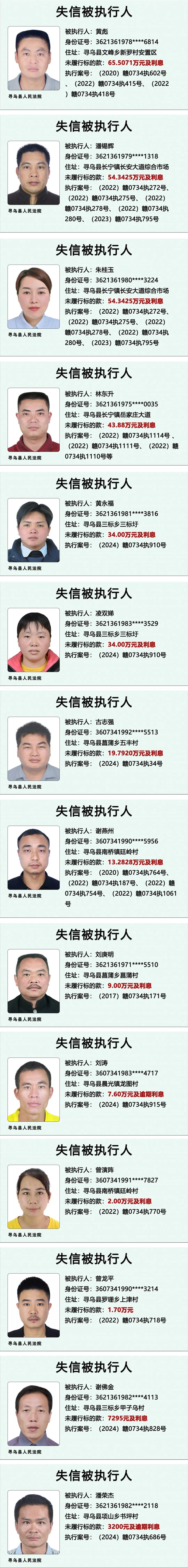 以下名单信息截止日期为2024年10月24日,根据案件结案情况及时更新,相关信息核实请联系寻乌县人民法院执行局,欢迎广大人民群众举报失信被执行人行踪及财产线索。