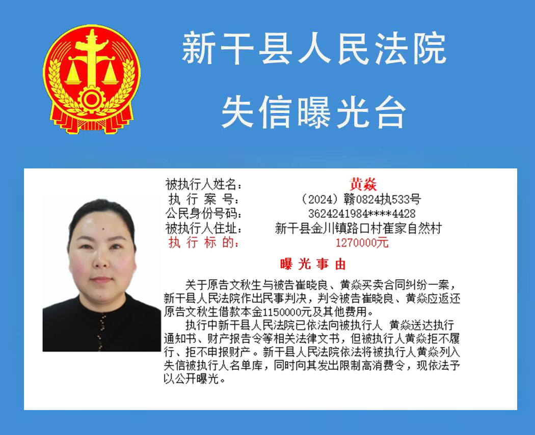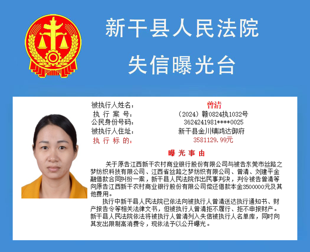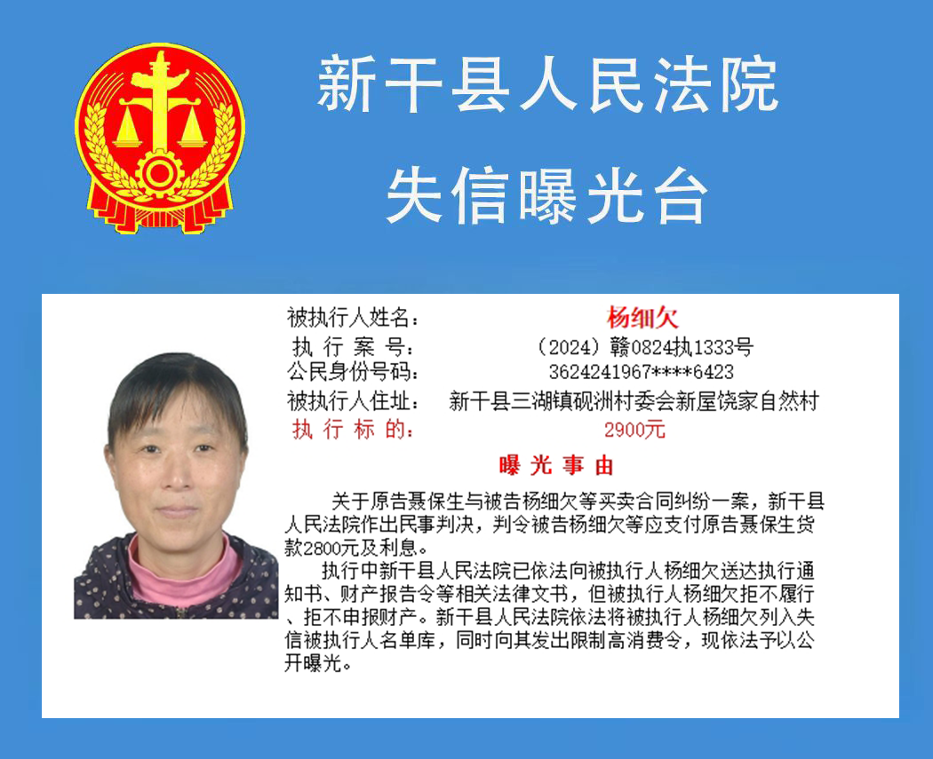 二、对以上失信被执行人名单信息内容,如有关当事人有异议,可向新干县人民法院书面申请更正。