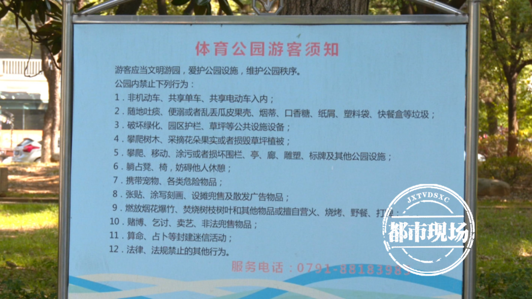 丁先生经常去往位于南昌市青山湖区洪都北大道的八一体育公园散步,无意之中,他注意到《体育公园游客须知》上第7条写明:禁止携带宠物;可实际情况并非如此。丁先生发现,在体育公园遛狗的人不少,且公园小道里还竖有“文明养犬 外出牵绳”的提示牌,这让他很是疑惑。