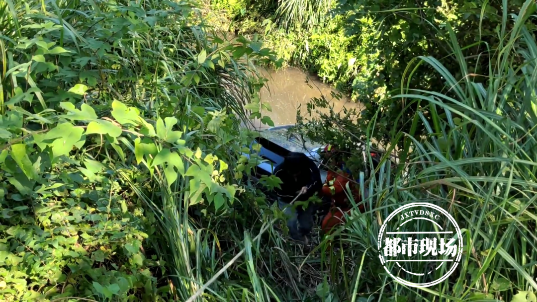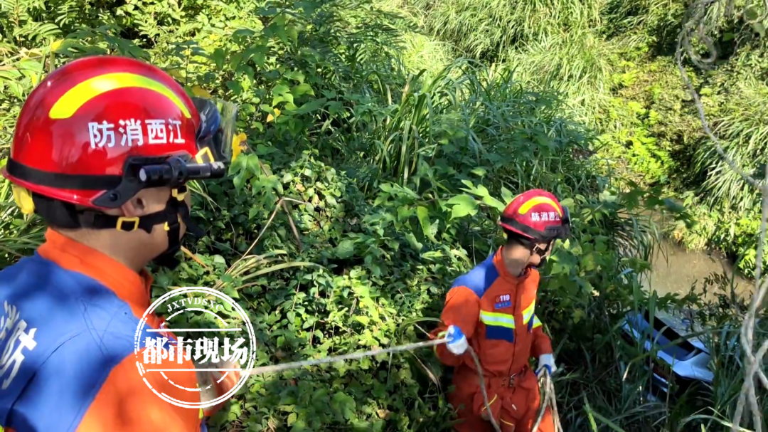 消防救援人员赶到现场,只见一辆新能源越野车车头扎进了河水里,好在车身还在岸边,没有入水,车辆与路面落差近10米,且坡度陡峭,车辆随时有下滑的可能。