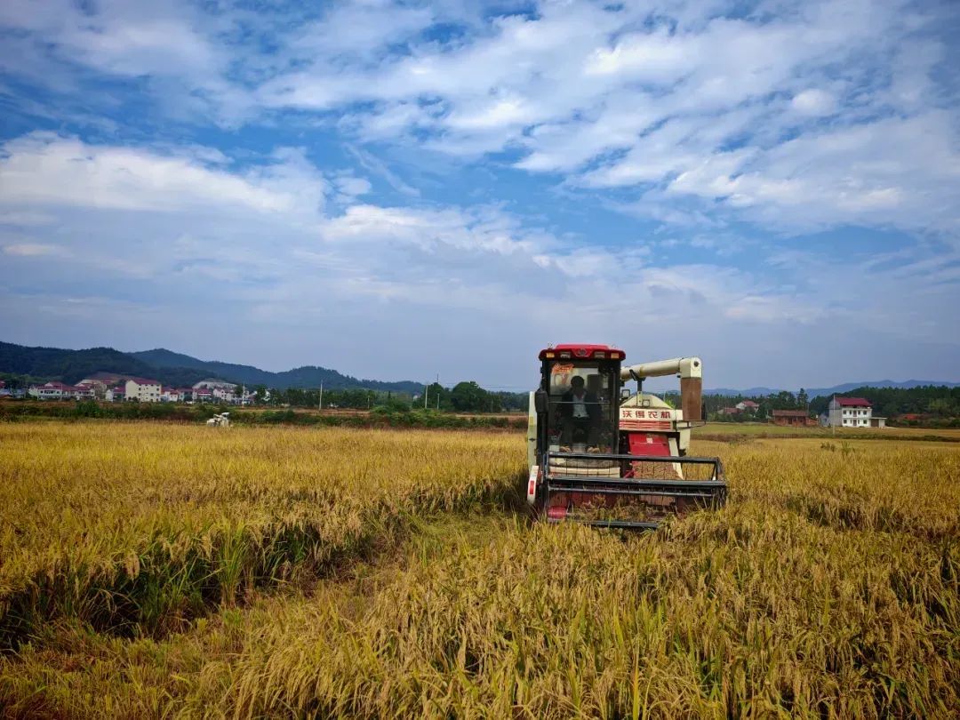 在红山村阡陌间,收割机开足马力、来回穿梭。伴随着机械的轰鸣声,一簇簇饱满的稻穗被快速卷入机器中,收割、脱粒、输出等工序一气呵成,所过之处留下平坦的辙印和秸秆,构建出美丽田园“丰”景线。