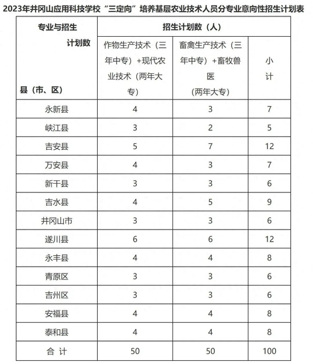 吉安市人民政府办公室关于落实井冈山应用科技学校2023年农业“三定向”招生计划的通知显示,为进一步充实乡(镇)农业公共服务机构技术人员队伍,提升乡(镇)农技人员素质,适应吉安市现代农业事业发展对人才的需要,市农业农村局根据全市基层农业技术人员现状,提出了2023年井冈山应用科技学校“三定向”培养基层农业技术人员招生初步计划数:100人;招生对象:应届初中毕业生;办学层次:中高职一体化长学制培养(“3+2”五年制大专);培养专业:作物生产技术(三年中专)+现代农业技术(两年大专)、畜禽生产技术(三年中专)+畜牧兽医(两年大专)。