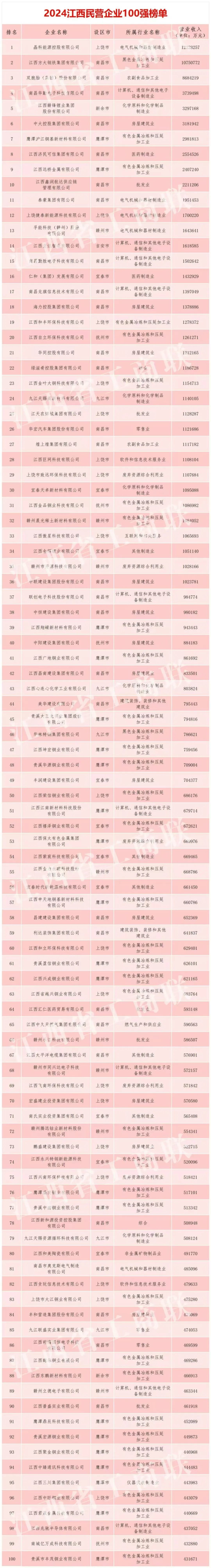 全省10个设区市有企业入围2024江西民营企业100强。其中,南昌市、鹰潭市、上饶市、宜春市均超过10家,南昌市增加3家。