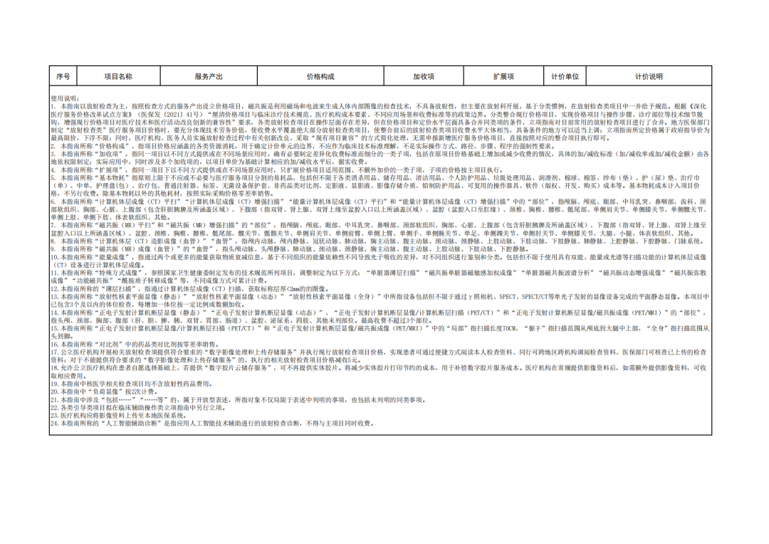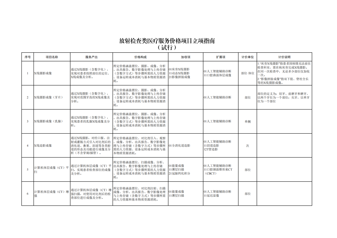 编制说明:为贯彻落实《深化医疗服务价格改革试点方案》,推进全国医疗服务价格项目规范编制工作,按照“成熟一批、发布一批”的工作思路,近日国家医保局编制印发《放射检查类医疗服务价格项目立项指南(试行)》,参考2023年版医疗服务项目技术规范,将现行放射检查类价格项目映射整合为26项,供各省医保局参考,结合实际做好对接落实,制定全省统一的价格基准,由具有价格管理权限的统筹地区对照全省价格基准,上下浮动确定实际执行的价格水平。