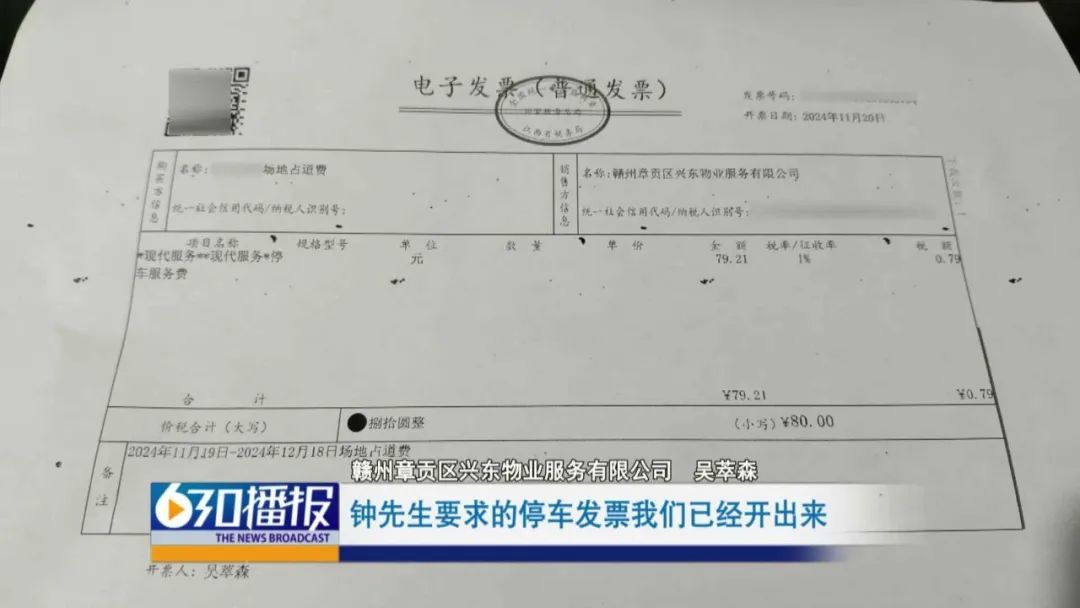 钟先生表示,自己希望物业能够开具80元的停车费发票。物业公司表示,目前发票也开具好了。