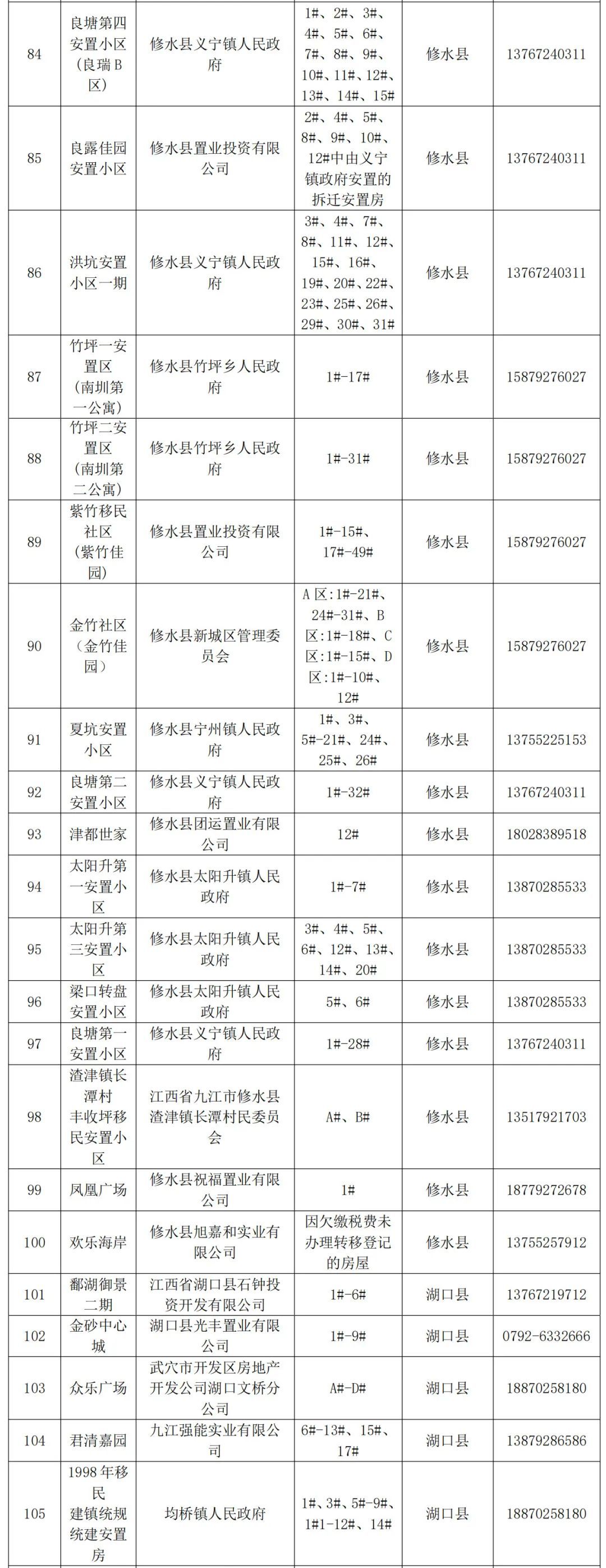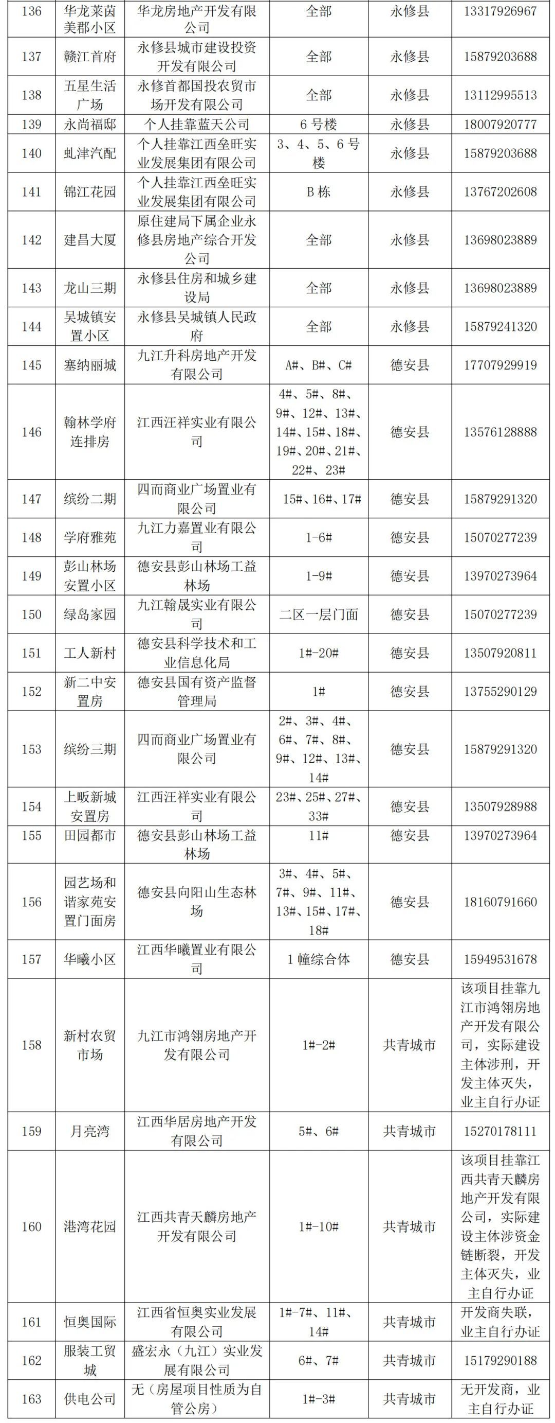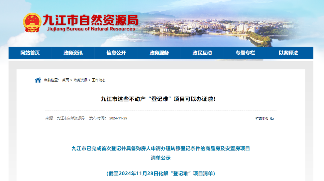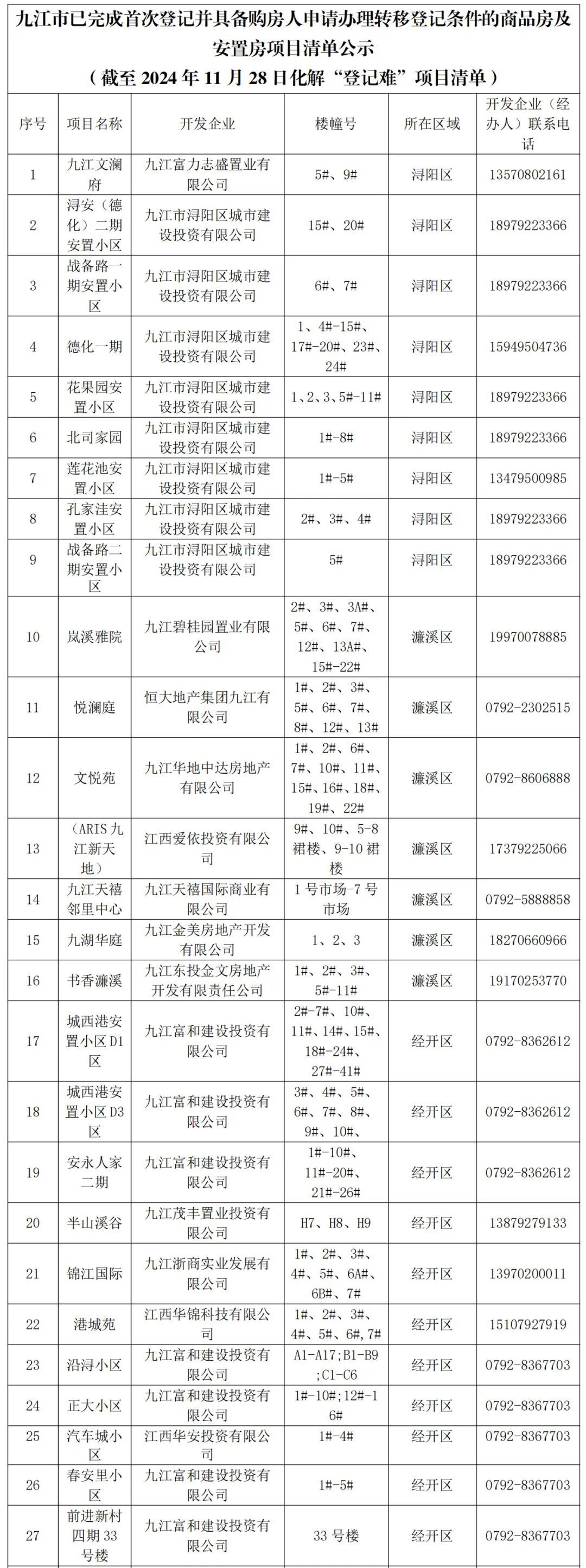 九江市不动产登记中心及各县(市、区)不动产登记中心已完成首次登记并具备购房人申请办理转移登记条件的商品房及安置房项目清单公示(截至2024年11月28日化解“登记难”项目清单)来啦!购房人可联系开发企业,委托开发商统一办理;也可找开发企业领取相关资料自行向所在区域的不动产登记中心申请办理不动产权证。