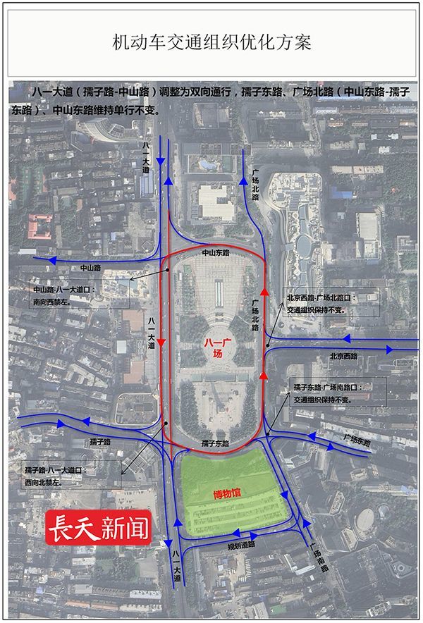 据了解,此次八一广场周边区域交通调整具体举措为:八一大道(孺子路-中山路)双向通行,八一大道与孺子路口西向北方向维持禁左,八一大道与中山路口南向西实施禁左,广场周围其他路段维持单行现状。