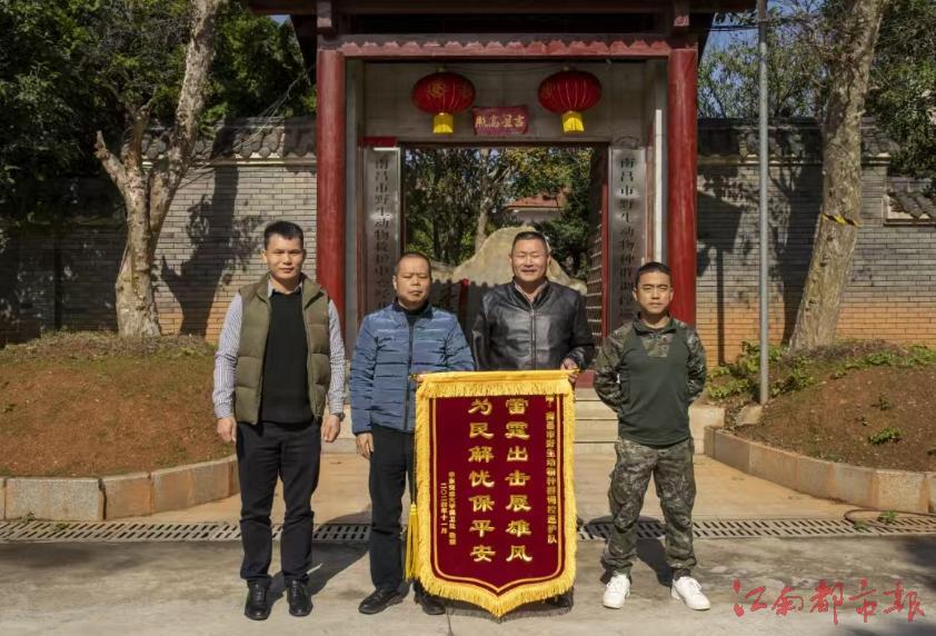 江南都市报讯 伦艺菲、全媒体记者章娜报道:日前,华东交通大学保卫处一行来到位于南昌经济技术开发区庐山北大道的南昌市洪城野生动物种群调控巡护队(以下简称巡护队)办公地点,为巡护队送上锦旗。