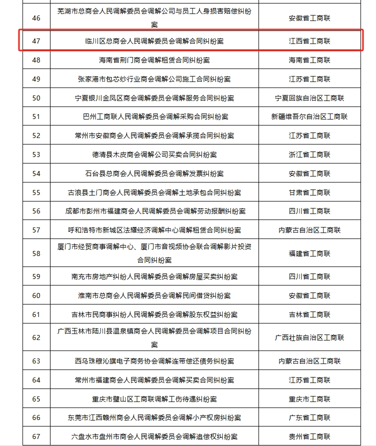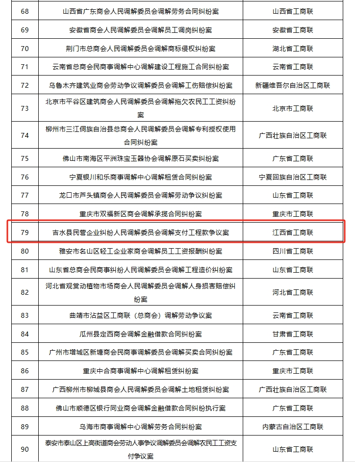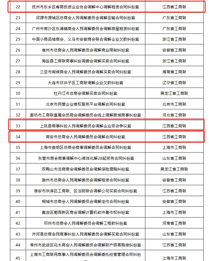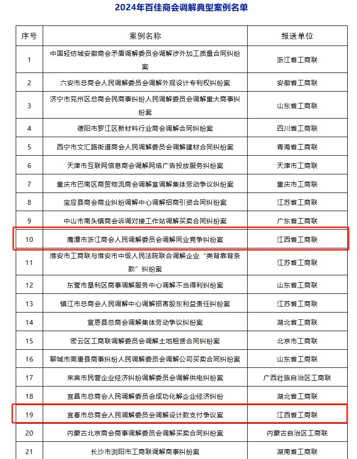 近日,全国工商联开展了“百佳商会调解典型案例”评选活动,聚焦案例的典型性、规范性和示范性,评选全国100件商会调解典型案例。经全国工商联组织专家评审,江西省工商联报送的“鹰潭市浙江商会人民调解委员会调解同业竞争纠纷案”“宜春市总商会人民调解委员会调解设计款支付争议案”“抚州市东乡区客商投资企业协会调解中心调解租赁合同纠纷案”“上犹县商事纠纷人民调解委员会调解企业劳动争议案”“高安市总商会人民调解委员会调解合同纠纷案”“临川区总商会人民调解委员会调解合同纠纷案”“吉水县民营企业纠纷人民调解委员会调解支付工程款争议案”等7个调解典型案例入选。