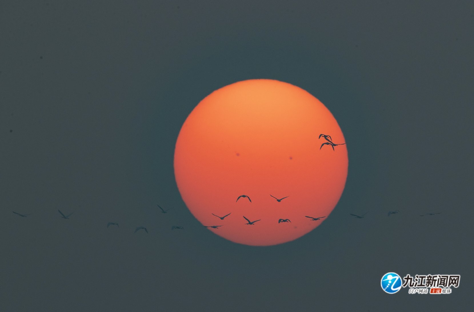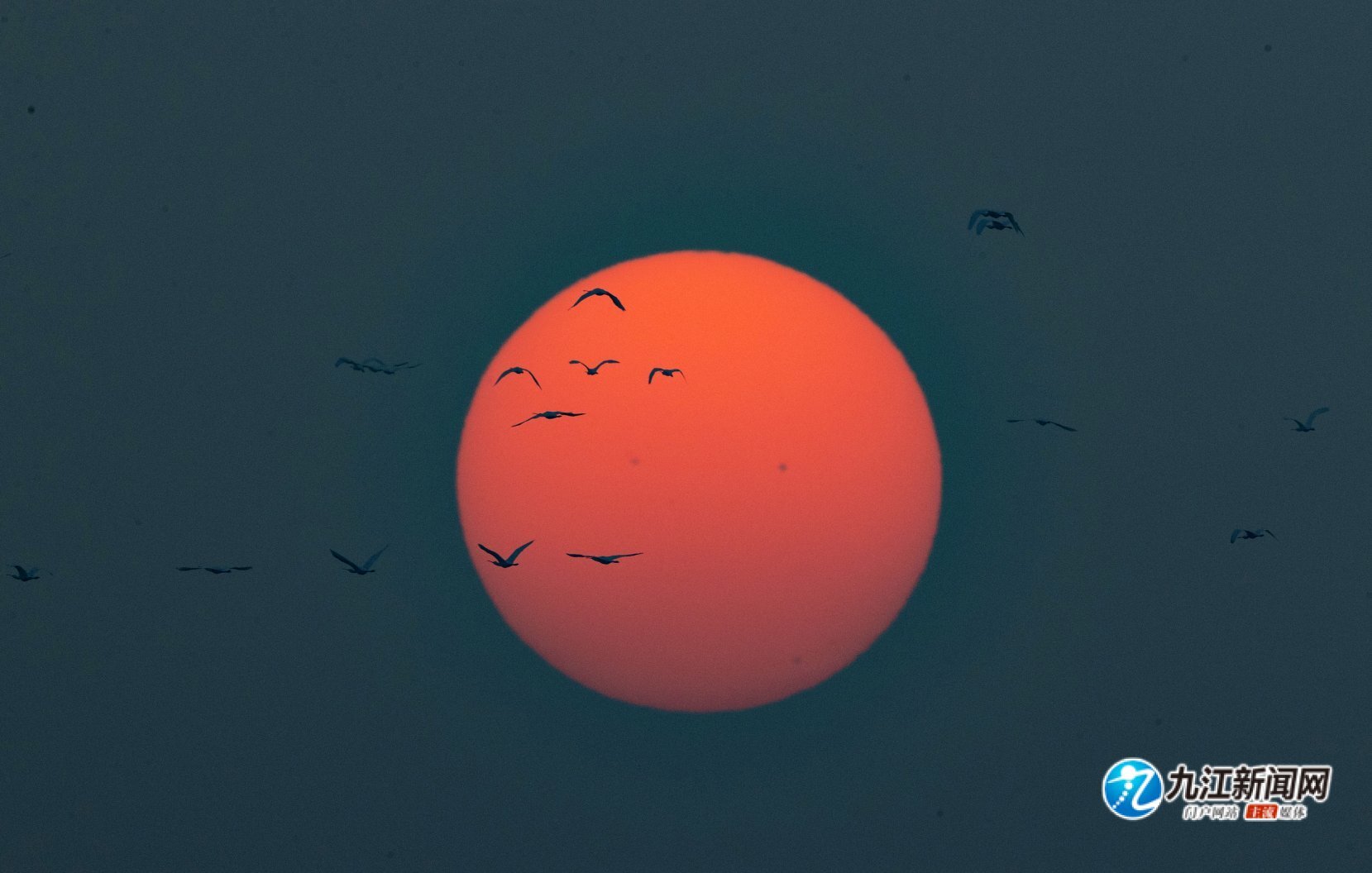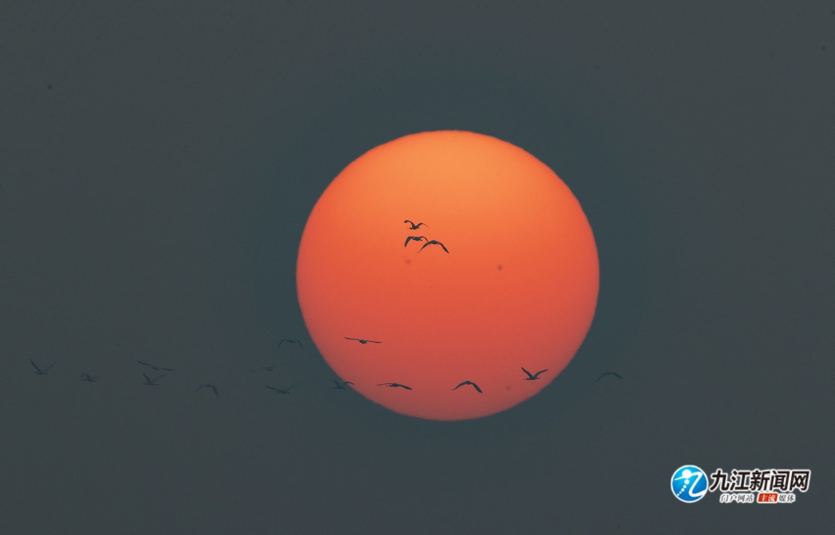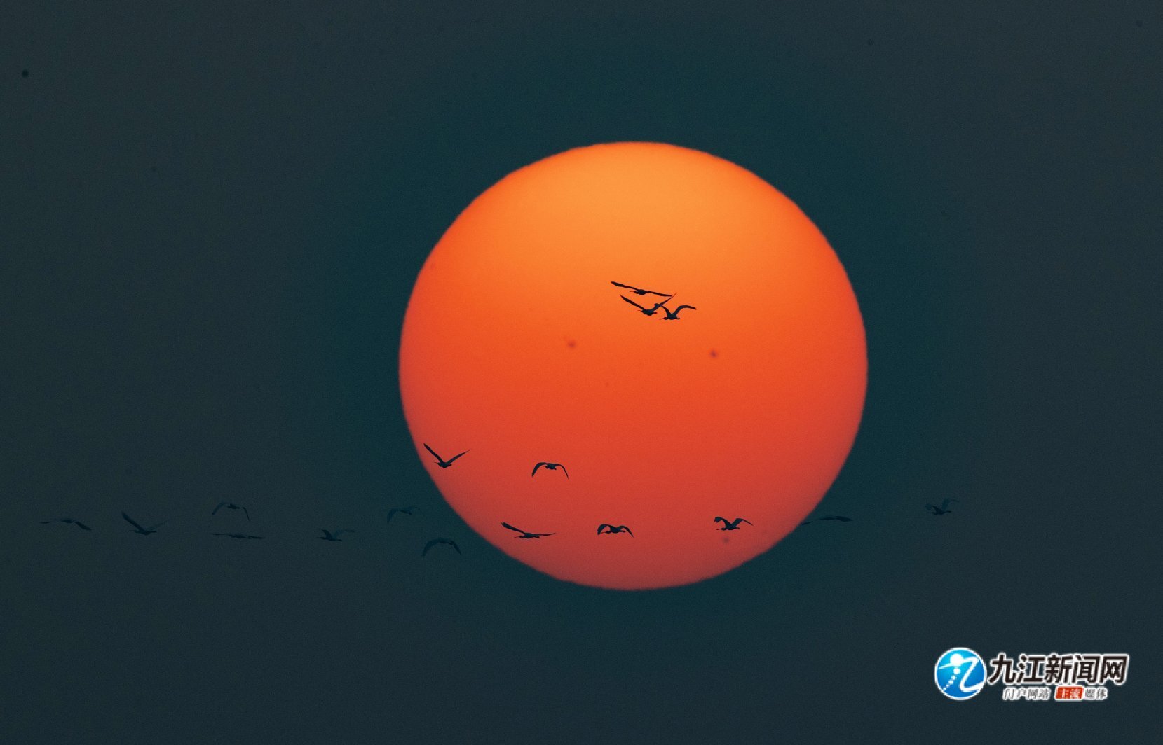 随着天气转凉,候鸟南迁迎来高峰。近日,在共青城市南湖湿地上空,成群的候鸟从西沉的太阳前飞过,呈现出唯美的“落日飞天”景观。