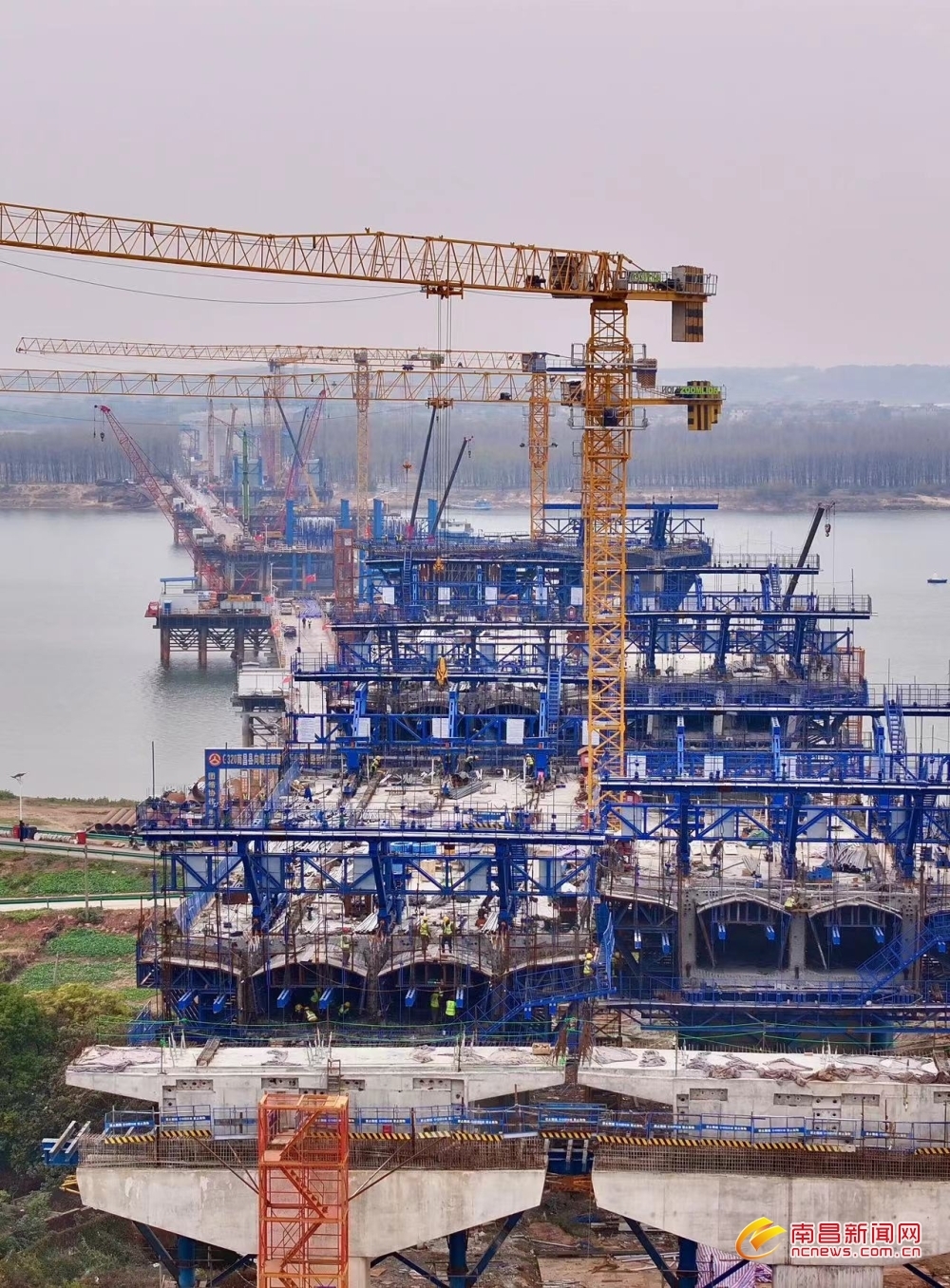 南昌新闻网讯 12月9日,G320向塘至西山段公路A标项目昌南大桥建设现场塔吊高耸,施工人员忙碌有序,一派繁忙景象。经过不懈努力,目前大桥的全部717根桩基施工已顺利完成。该项目作为连接我市南昌县、红谷滩区乃至新建区的重要通道,其建设对于改善我市交通环境、提升区域交通能力具有重要意义。(洪观新闻记者 成奔 摄)
