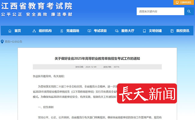今视频客户端讯 12月9日,江西省教育考试院发布2025年高职单招考试工作通知,2025年3月3日9:00-5日17:00网上报考 通过高职单招录取的考生,与参加统一高考录取的考生享受相同待遇。