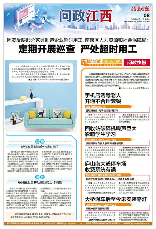 近日,有网友在大江网《问政江西》发帖反映,赣州市南康区部分家具制造企业存在超时用工现象,建议政府部门加强劳动监察执法力度,对企业开展定期巡查,营造有序用工环境。
