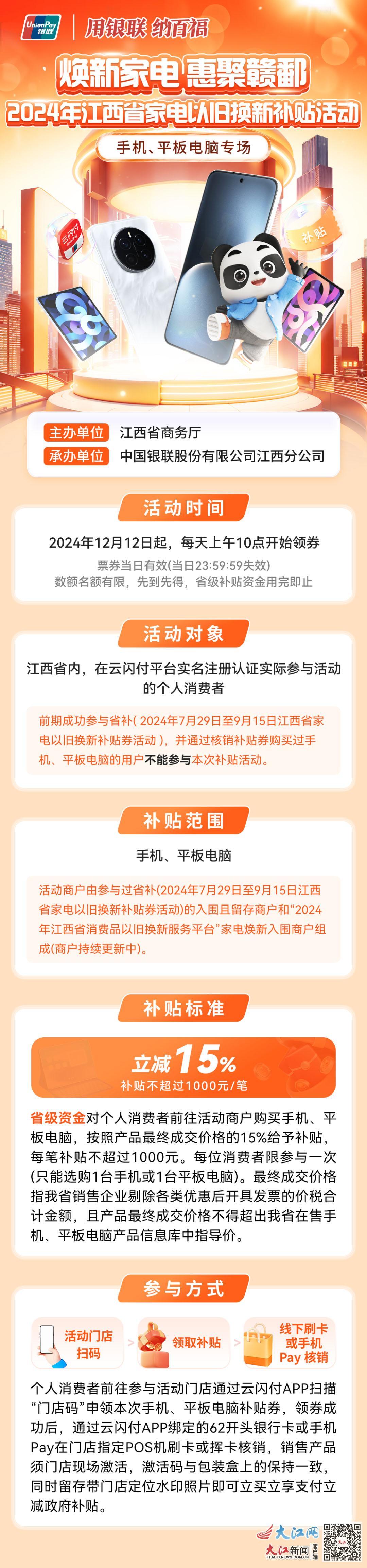 需要注意的是,前期成功参与“省补”(2024年7月29日至9月15日江西省家电以旧换新补贴券活动),并通过核销补贴券购买过手机、平板电脑的用户不能参与本次补贴活动。