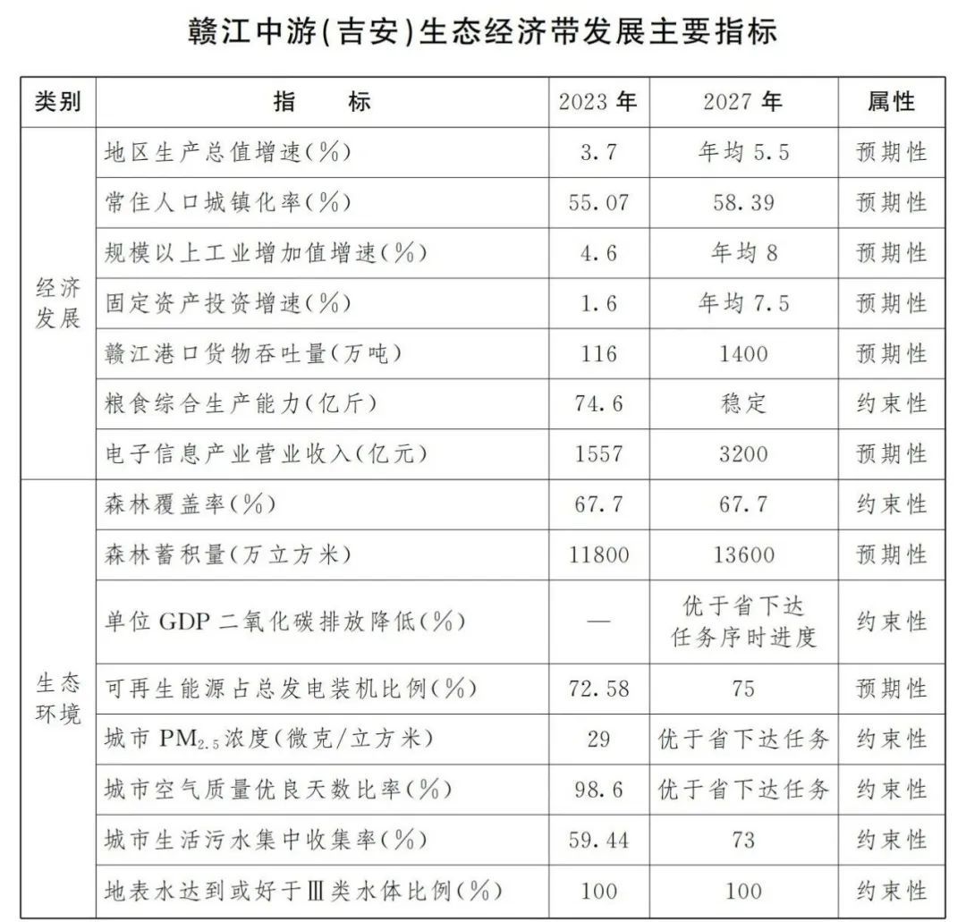到2027年,赣江中游(吉安)生态经济带高质量发展迈出坚实步伐,吉安市主要经济指标增幅高于全国、全省平均水平,装备制造产业、新材料产业营业收入进入千亿元行列;中心城区辐射带动能力显著增强;主要污染物排放总量、单位地区生产总值能耗和二氧化碳排放强度在省控制范围内。