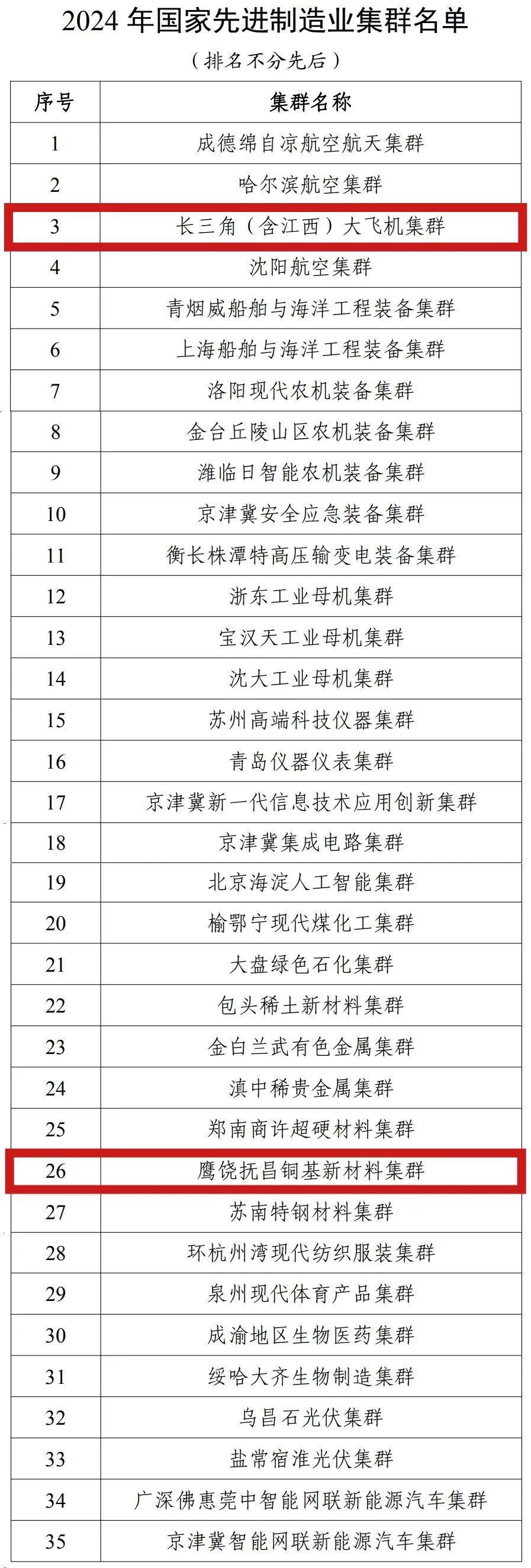 为贯彻落实党中央、国务院决策部署,培育壮大先进制造业集群,工业和信息化部组织开展2024年先进制造业集群竞赛。经小组赛、综合赛评审并向社会公示,现公布成德绵自凉航空航天集群等35个集群为国家先进制造业集群(以下简称国家级集群),有关事项通知如下。